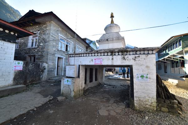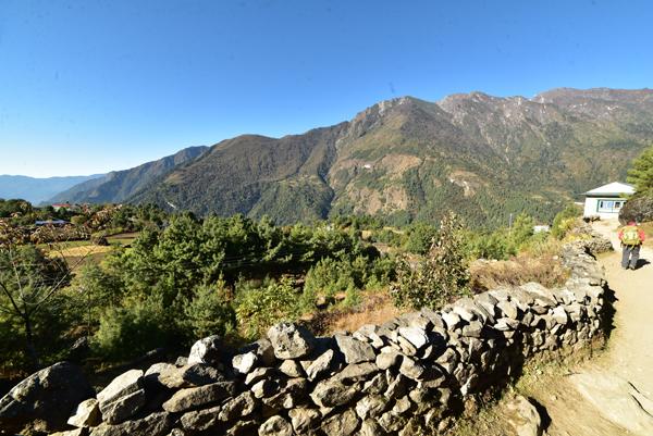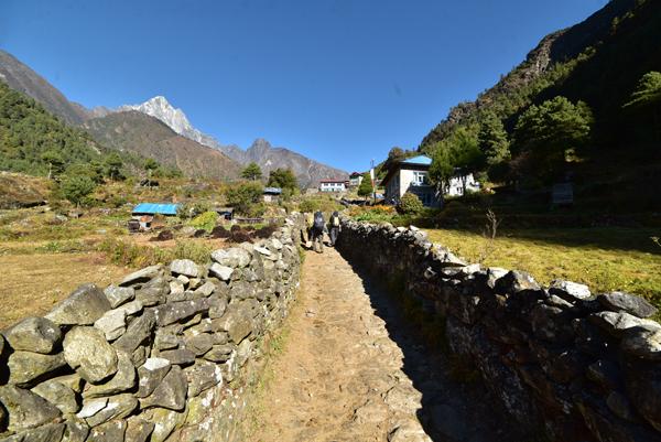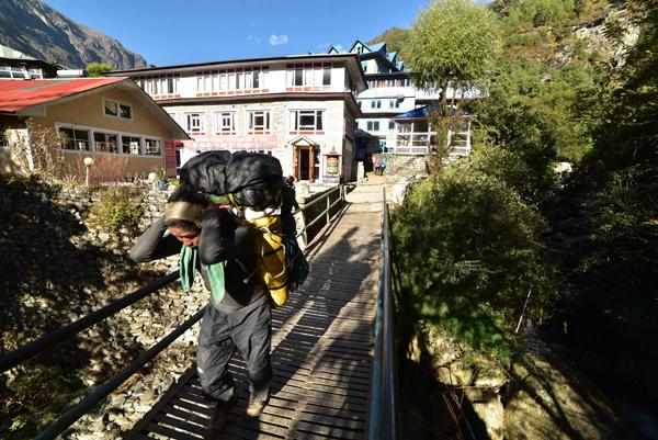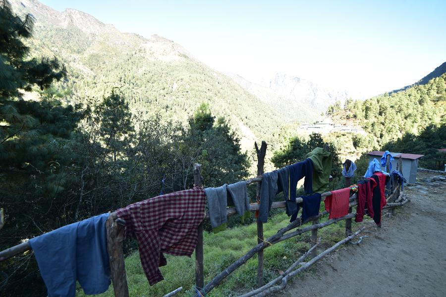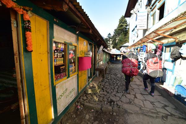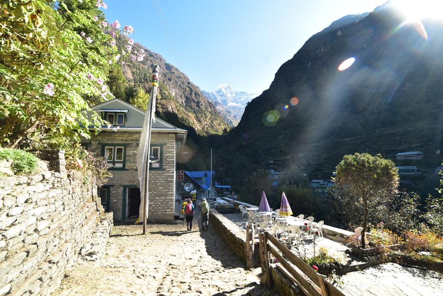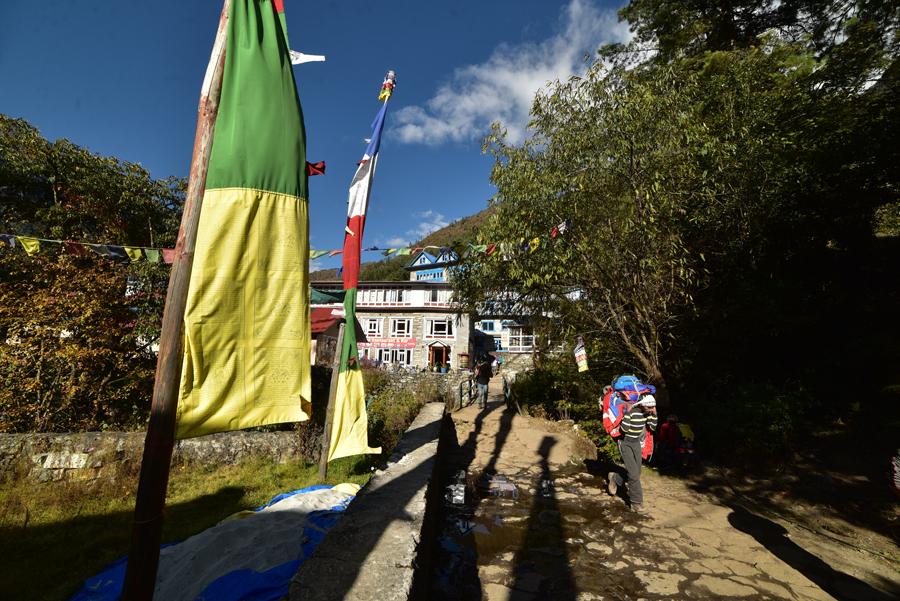 La végétation justement. À 2.860 mètres d’altitude, elle est encore plutôt luxuriante et variée. Étonnant. Mais le plus insolite reste la succession de petits villages et de refuges que nous allons croiser sur notre route. À mille lieues de ce que j’avais imaginé. Le chemin de l’Everest est avant tout une très bonne affaire pour tous les Sherpas du coin qui ont ouvert lodges et chambres d’hôtes.