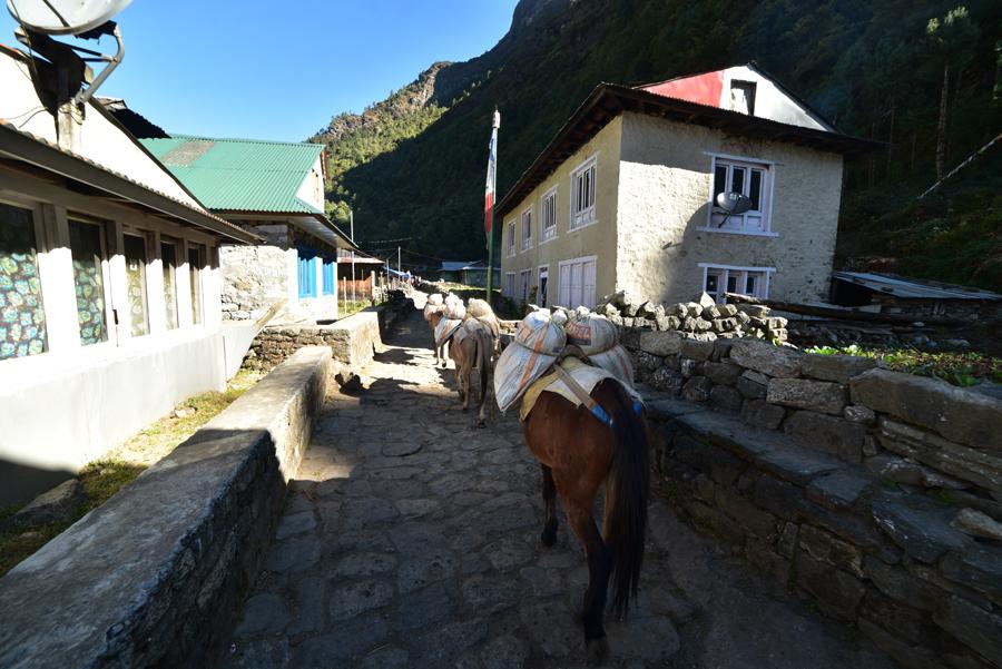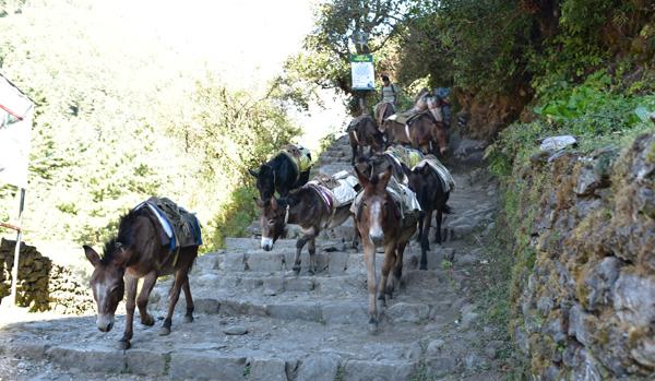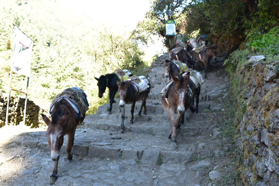 Sur le chemin, nous croisons les caravanes des porteurs avec leurs ânes qui font la navette entre Lukla et Phakding.