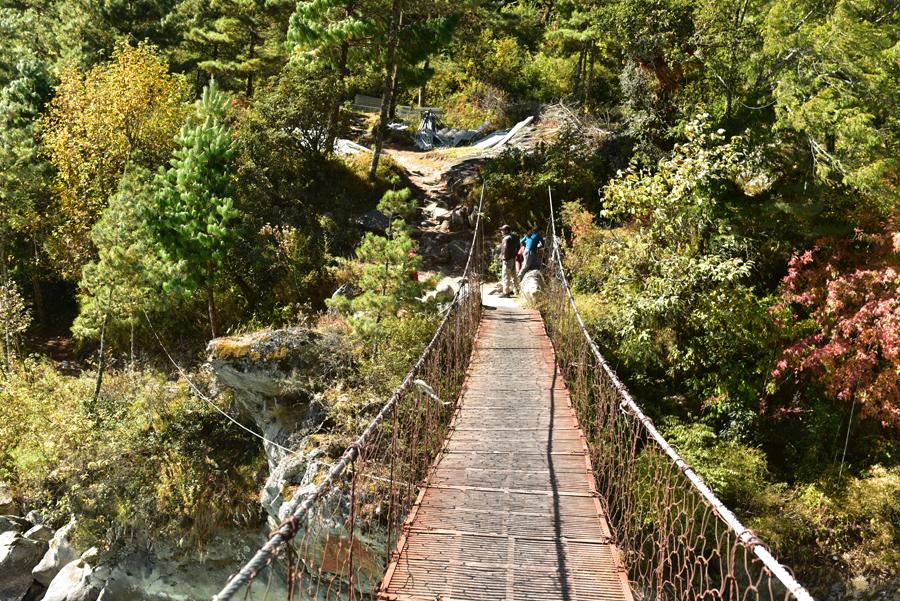 Après une petite heure de promenade, on retourne sur nos pas et on traverse de nouveau le pont suspendu. Franchement, ça n’a rien de vraiment dangereux. Chaque année, la communauté sherpa veille à la solidité des ponts qu’elle jette sur la rivière. Et s’il le faut, tout le village est mis à contribution pour faire un nouveau pont.