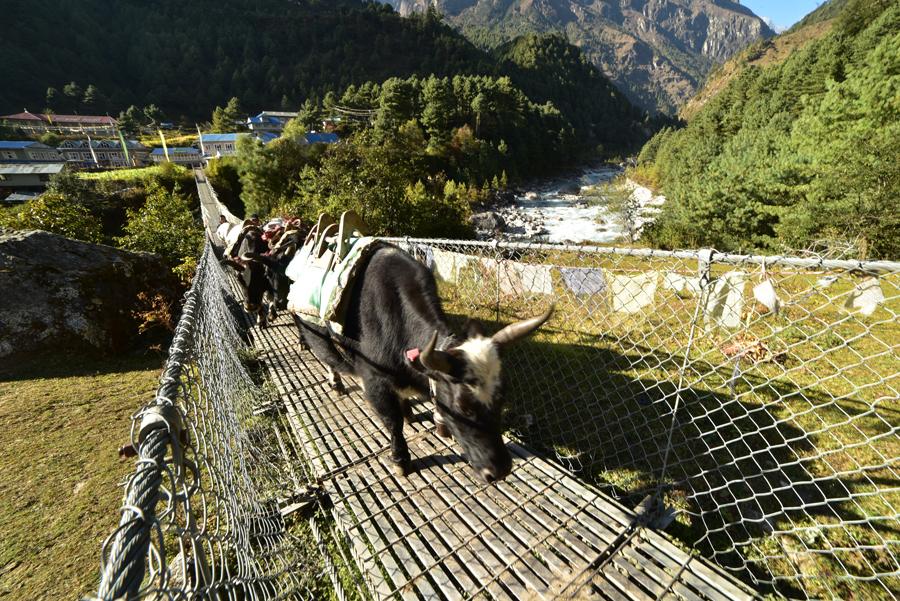 Un peu plus haut, une nouvelle passerelle permet d’enjamber la rivière de lait. Mais cette fois-ci, il s’agit d’un pont suspendu d’un tout autre calibre capable de supporter non seulement les humains, mais les troupeaux de yaks que les éleveurs ramènent des sommets.