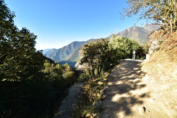 Pour mes premiers pas dans l’Himalaya, j’ai droit à un premier jour plutôt tranquille. Le chemin est plutôt sympa, pas trop caillouteux, à flanc de montagne et sans réelles difficultés. Du coup, ces deux heures trente de marche vont passer très vite.
