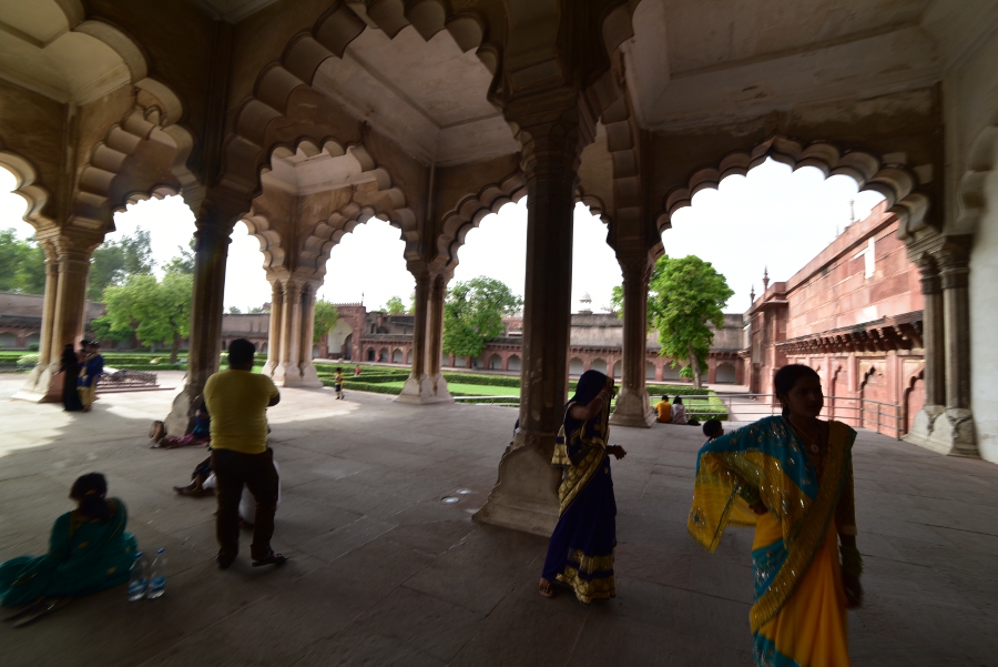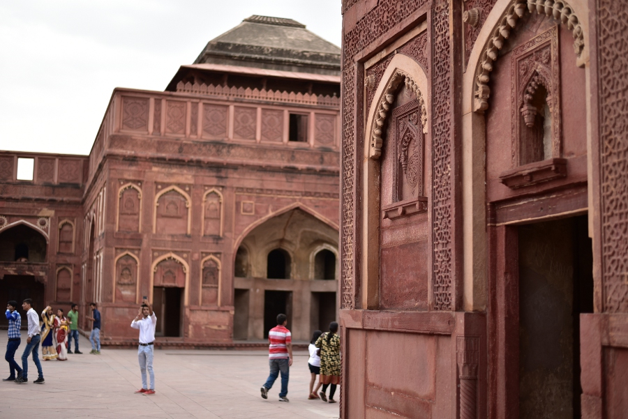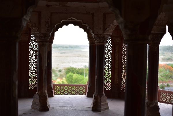 Je profite du temps qui me reste pour retourner sur mes pas et admirer tranquillement les coulisses du palais de l’empereur. Sa belle vue sur la rivière Yamuna et le Taj Mahal, au loin.