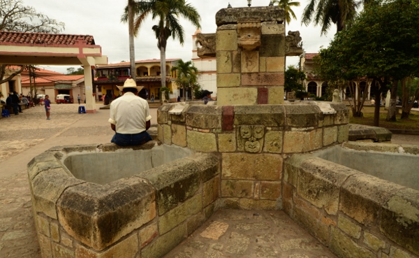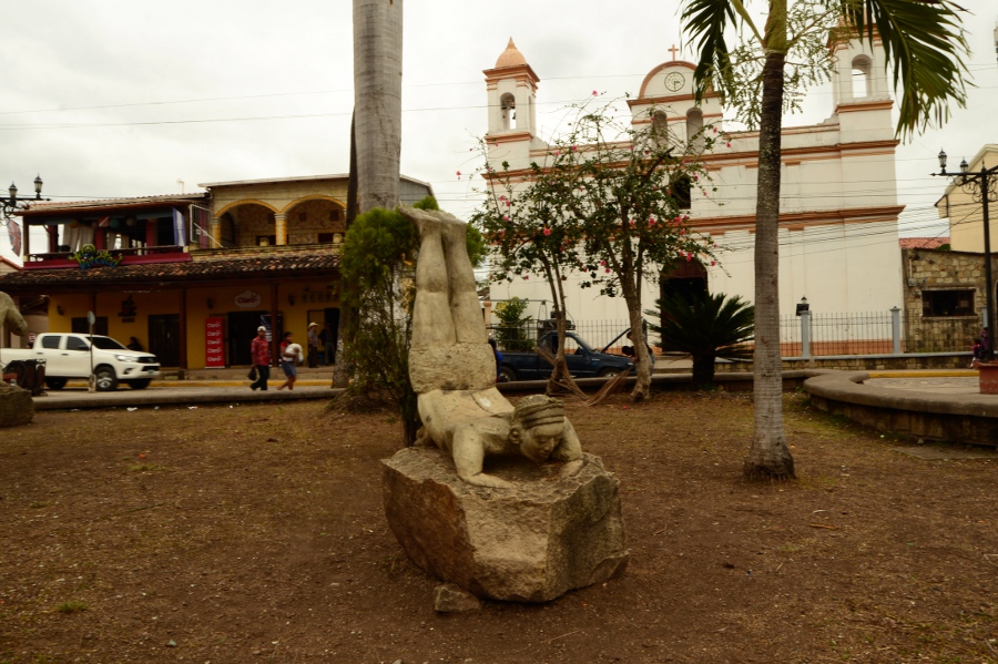 Mardi 31 janvier. Retour à Copán. Ce matin, je prends un peu de temps pour me promener dans le bourg avant de prendre le bus du retour pour le Guatemala. Pas grand-chose à voir à Copán hormis sa petite placette centrale où se dressent quelques statues emblématiques de la cité maya.