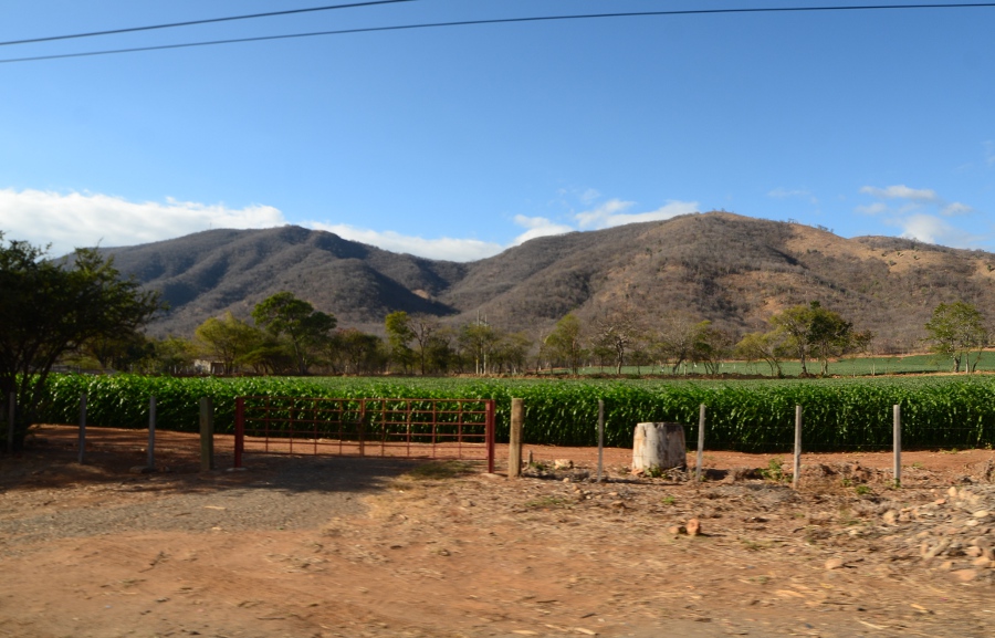 En chemin, on retrouve les champs jusqu’à perte de vue, et au loin, la chaîne des volcans.