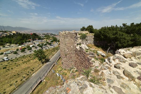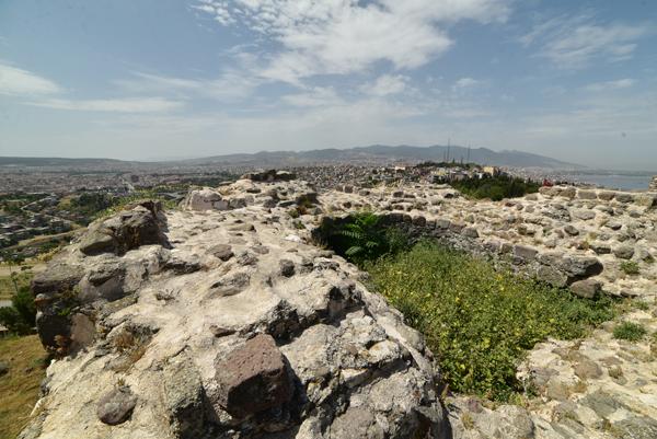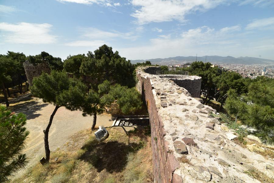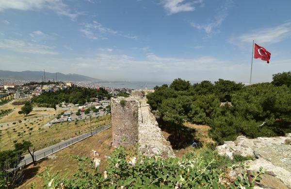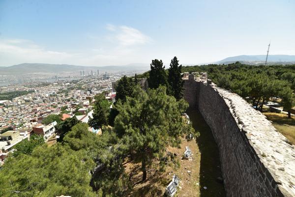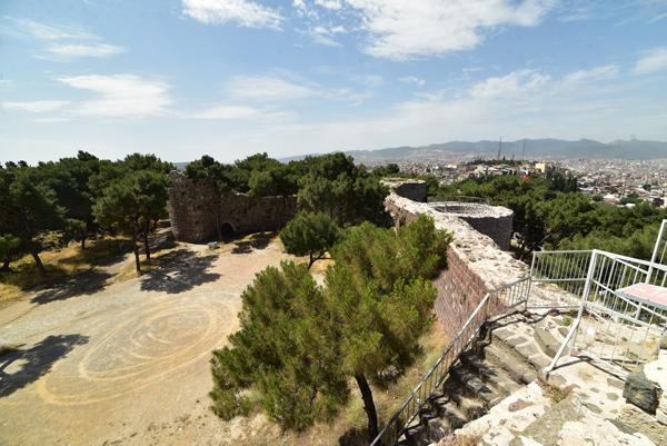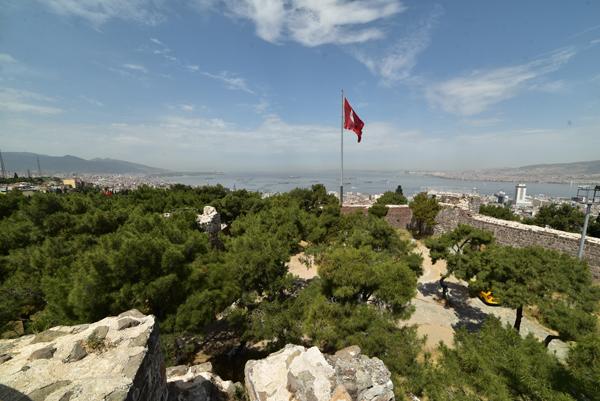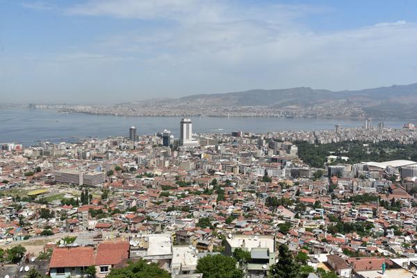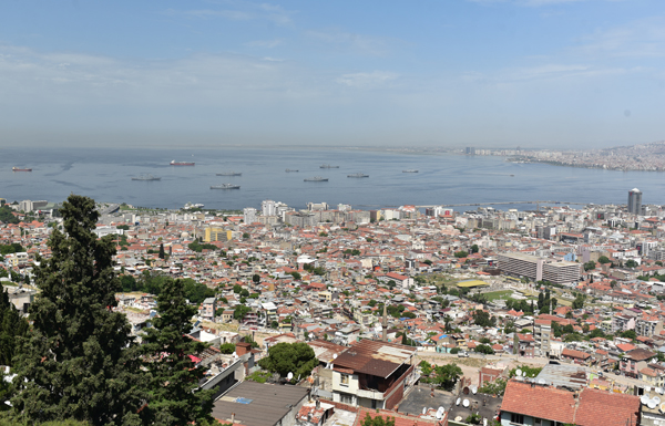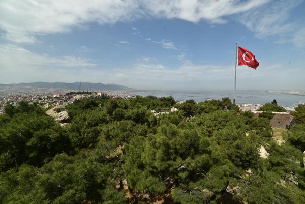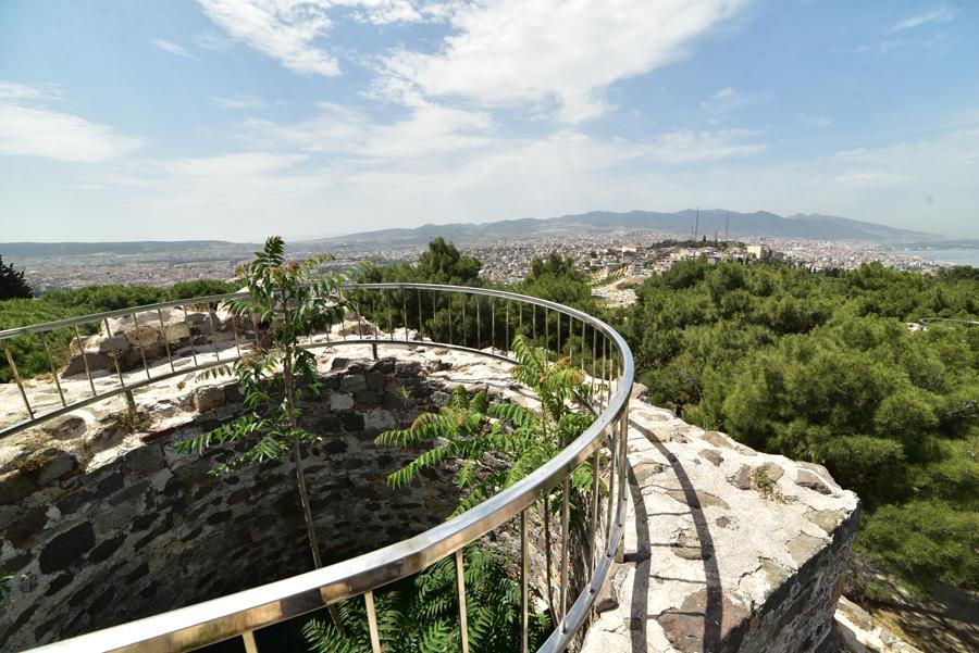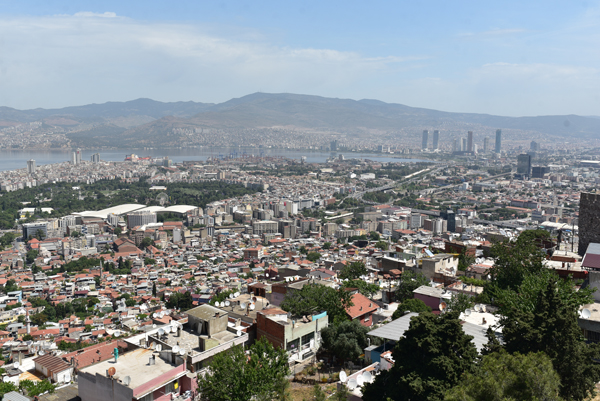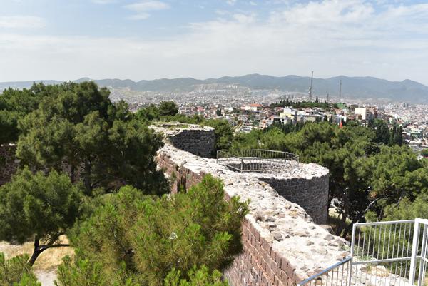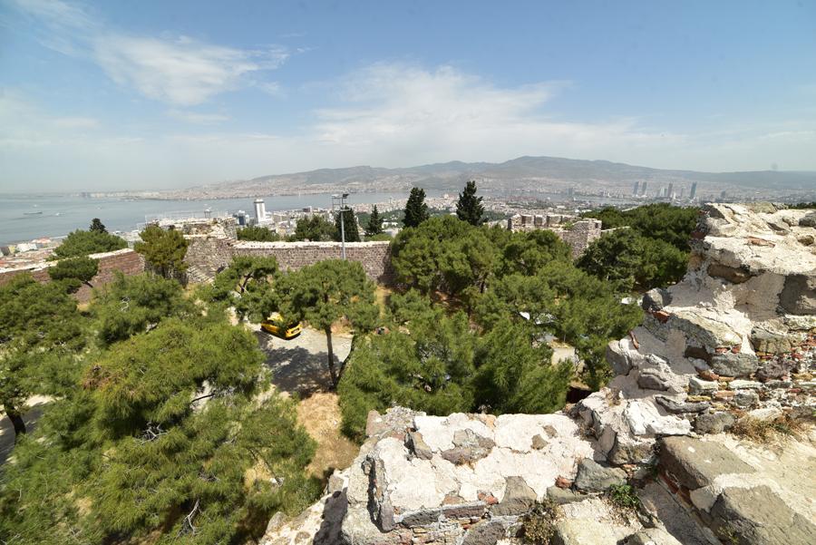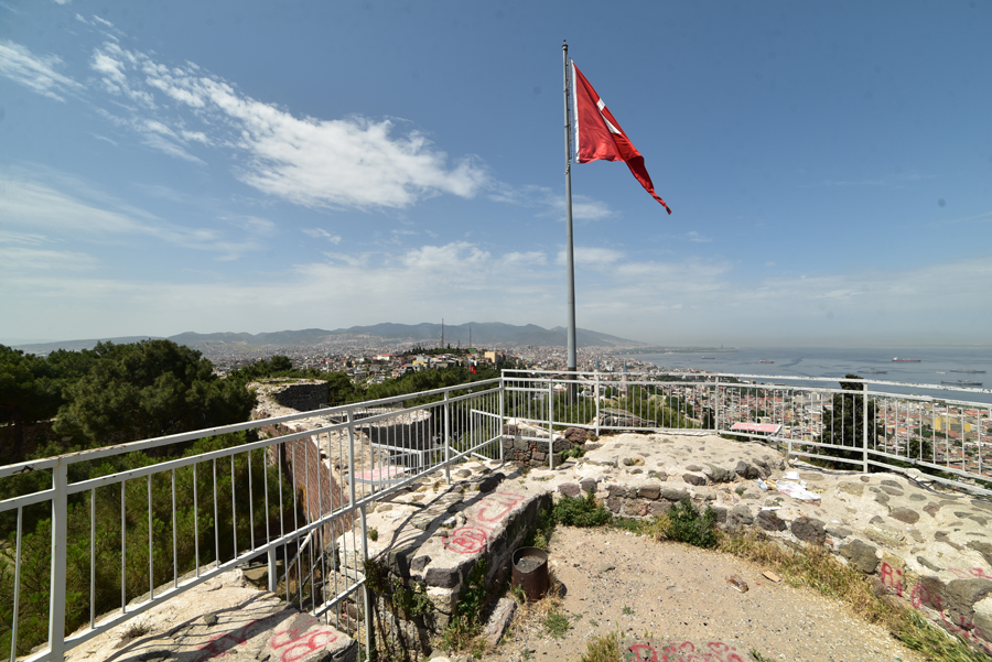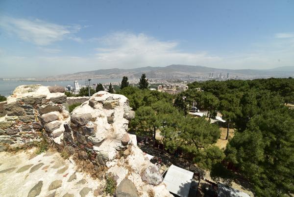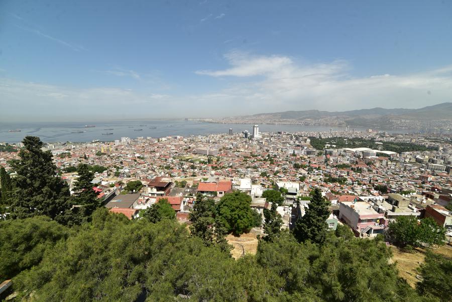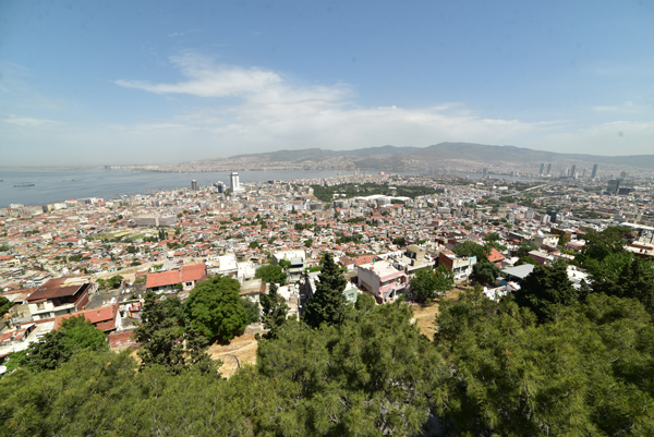 Le sommet de la colline offre un large panorama sur la ville et l’échancrure de sa baie avec au premier plan, tout le long de la pente qui descend jusque dans la mer Égée, le labyrinthe des ruelles des quartiers populaires d’Izmir.