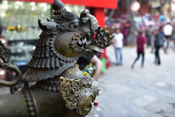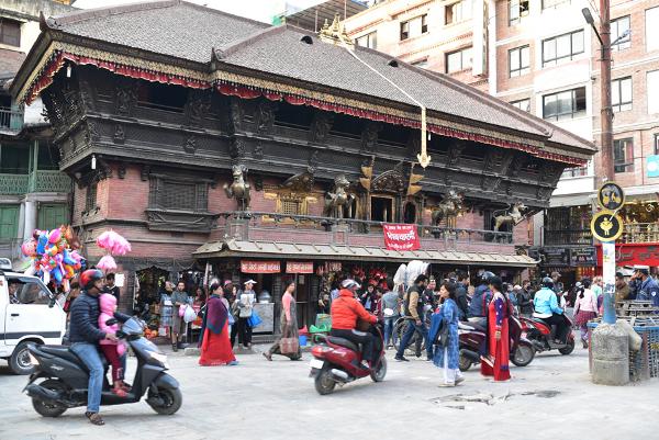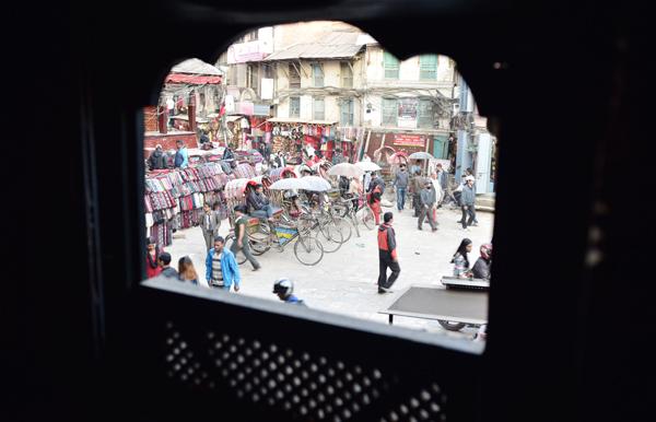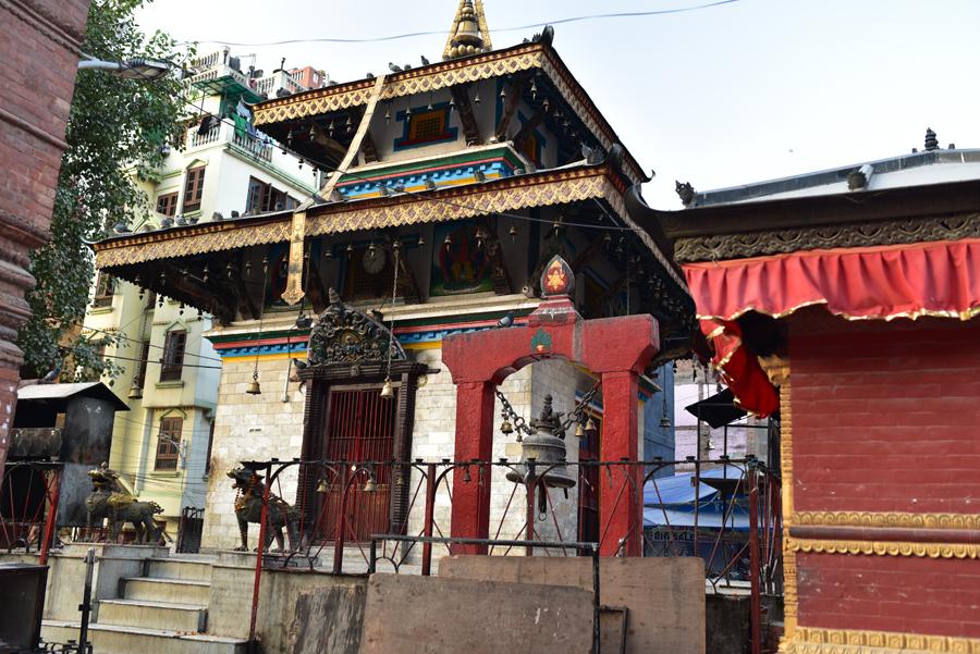 Depuis le temple, on peut profiter d’une vue de la rue encombrée des tuks-tuks et des marchands ambulants. Une collection de magasins vend des topi (chapeaux de tissu) et la robe traditionnelle népalaise.