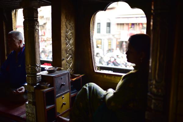 Machendranath Bahal. Ce temple attire à la fois les bouddhistes et les hindous. Les bouddhistes considèrent Seto (blanc) Machhendranath comme une forme d’Avalokiteshvara, alors que pour les hindous, il incarne Shiva. L’entrée voûtée du temple a été détruite lors du tremblement de terre de 2015 et le temple est actuellement fermé pour réparations. Du coup, on ne peut que pénétrer dans l’antichambre du temple. C’est là que je ferai ces quelques portraits.