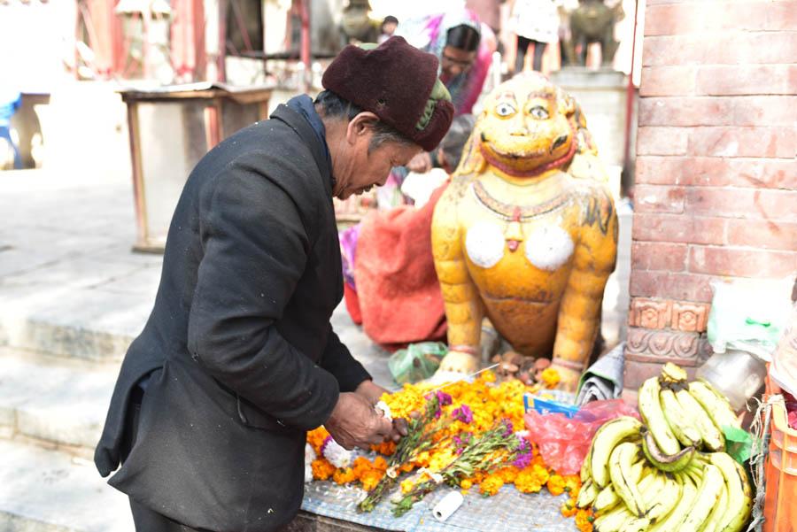 Plus loin, un autre fidèle qui vient apporter une offrande et des colliers de fleurs à son dieu.