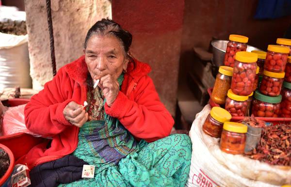 Dans les rues de la vieille ville, les marchands tiennent boutique en se plaçant sur les trottoirs. Une vieille femme grille une cigarette en attendant les clients.