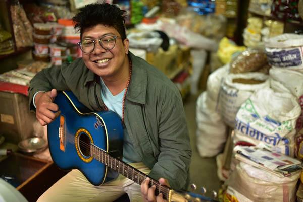 Un autre joue de la guitare et chante John Lennon tout en tenant boutique.