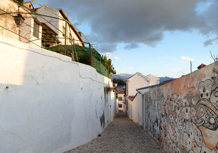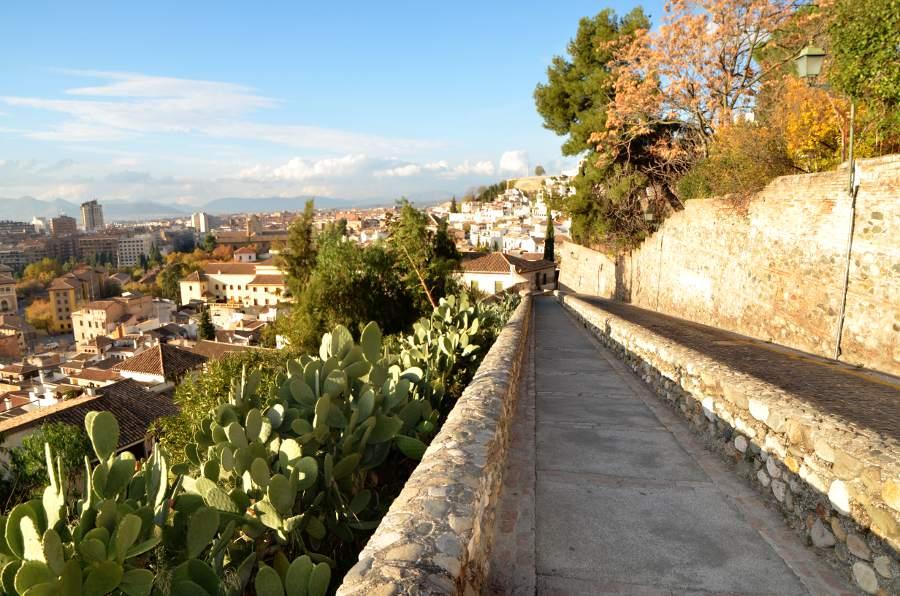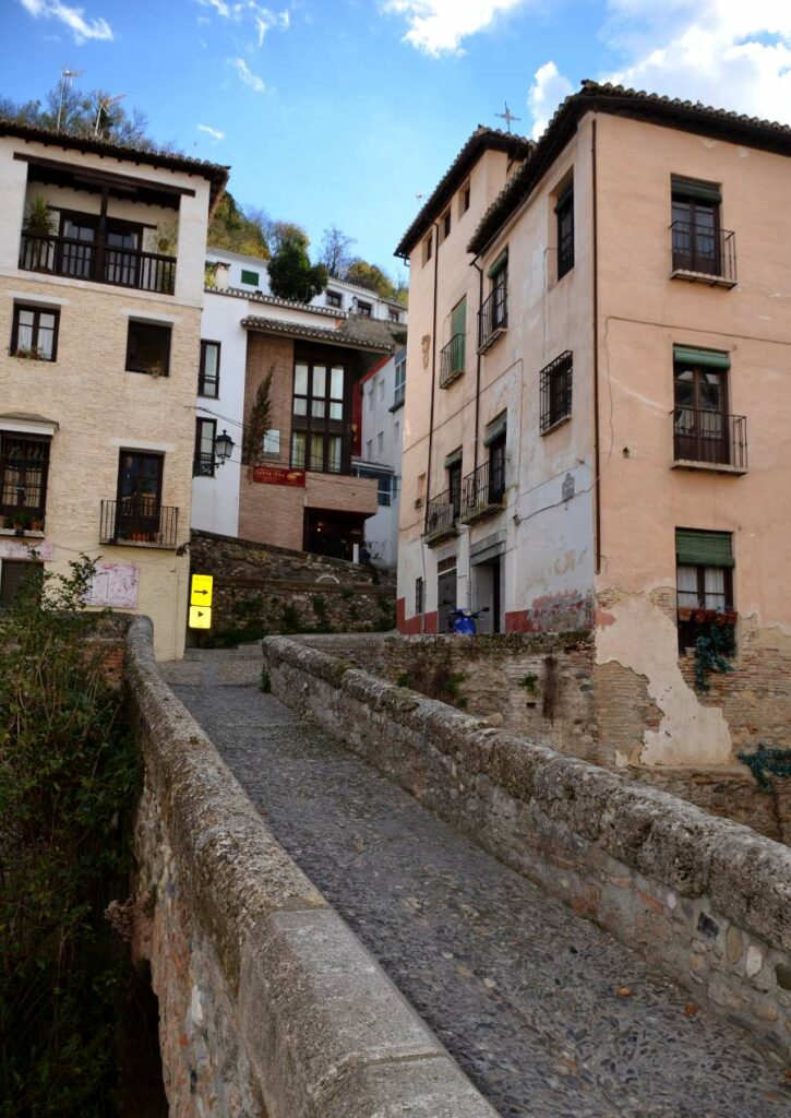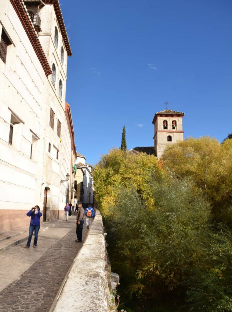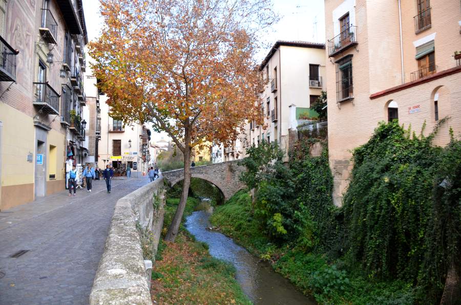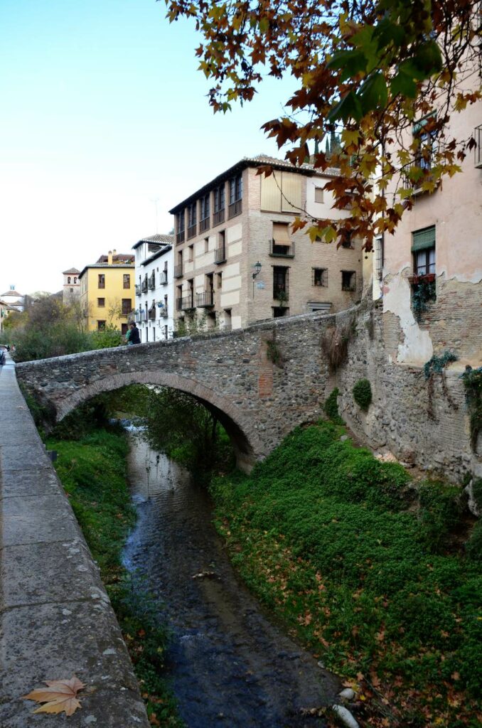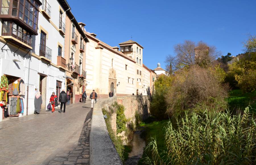 La visite de l’Albaicín commence le long de la minuscule rivière encaissée entre les deux collines de Grenade. C’est ici que coule le Darro. Pour visiter le quartier, il faut donc d’abord longer le cours d’eau surplombé par de petits ponts de pierre très pittoresques qui mènent à l’autre rive hérissée de maisons blanches.