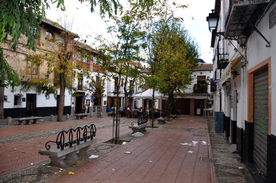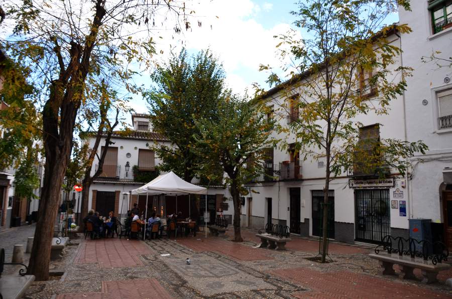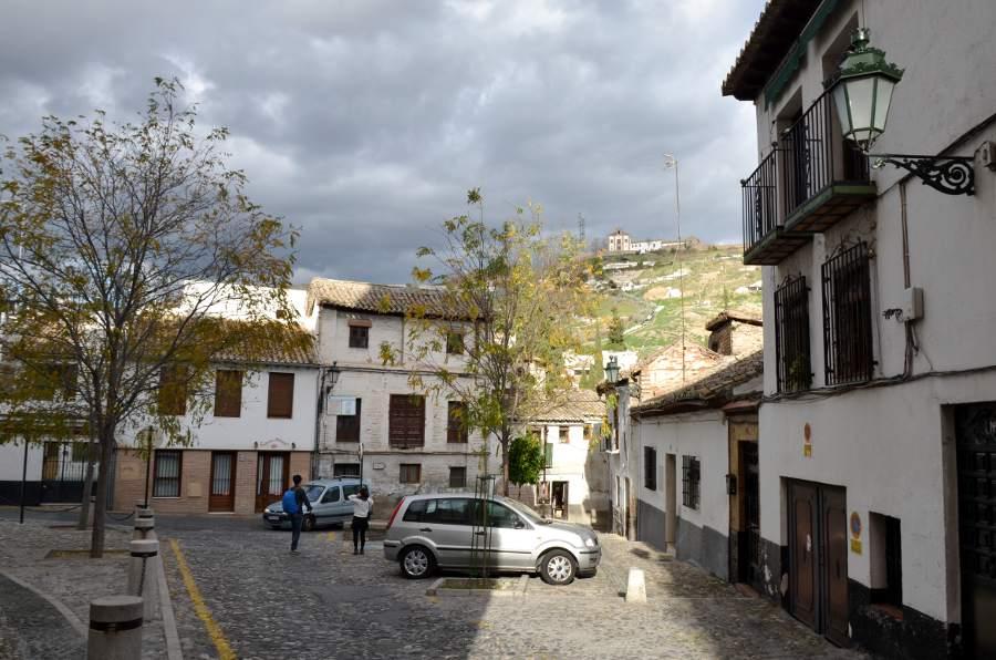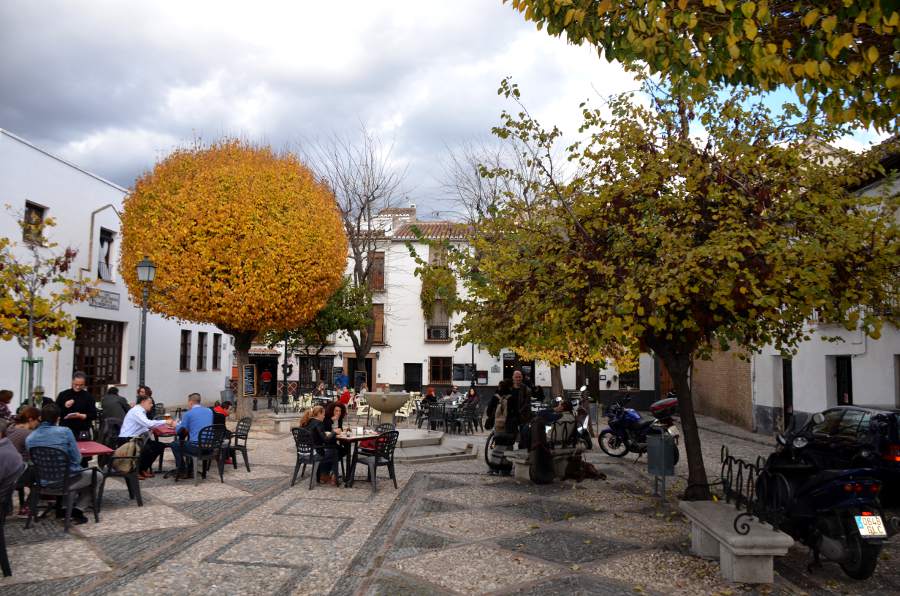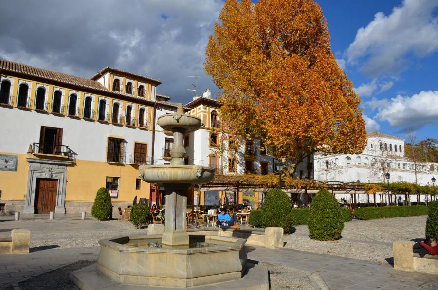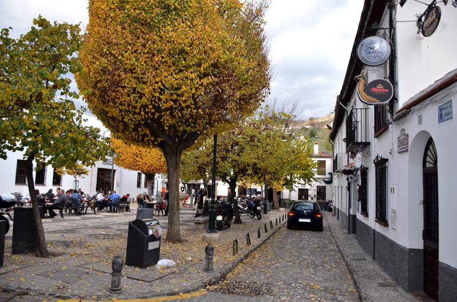 Plus haut encore, une place tout en longueur permet de profiter d’une vue magnifique sur la colline de l’Alhambra. Puis en se retournant, je ne peux qu’admirer les couleurs automnales des arbres qui viennent rehausser le jaune des boiseries des maisons environnantes. Quel spectacle !