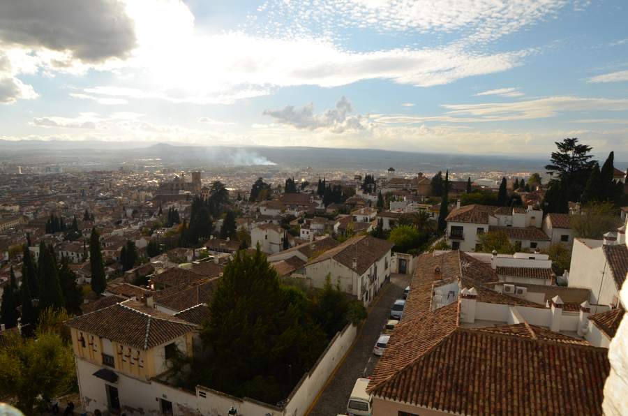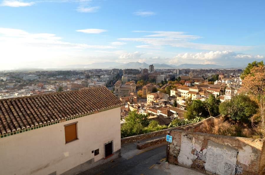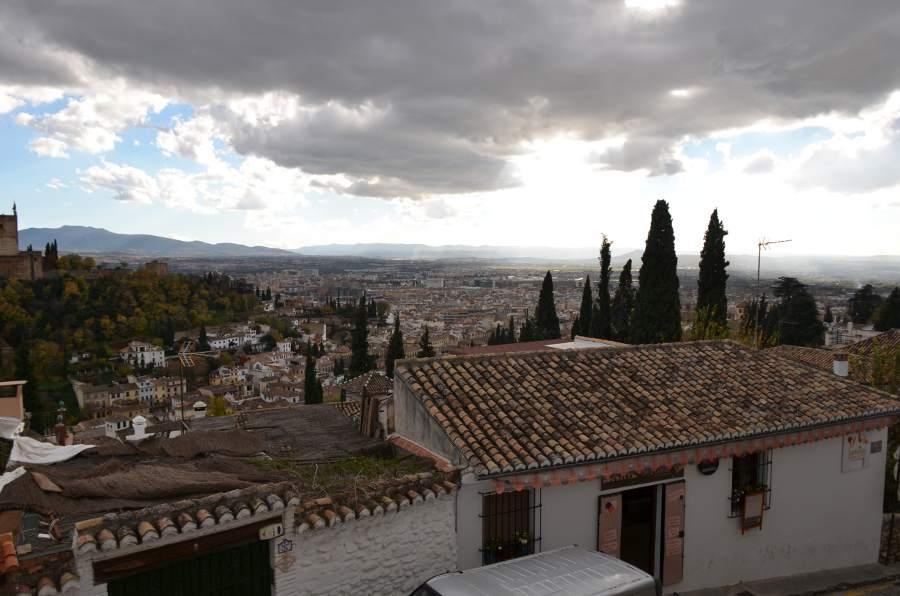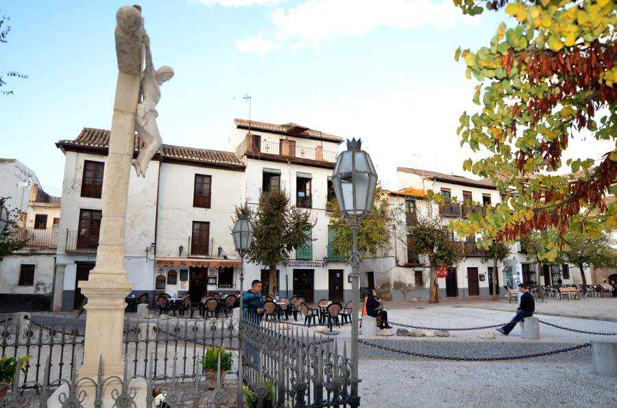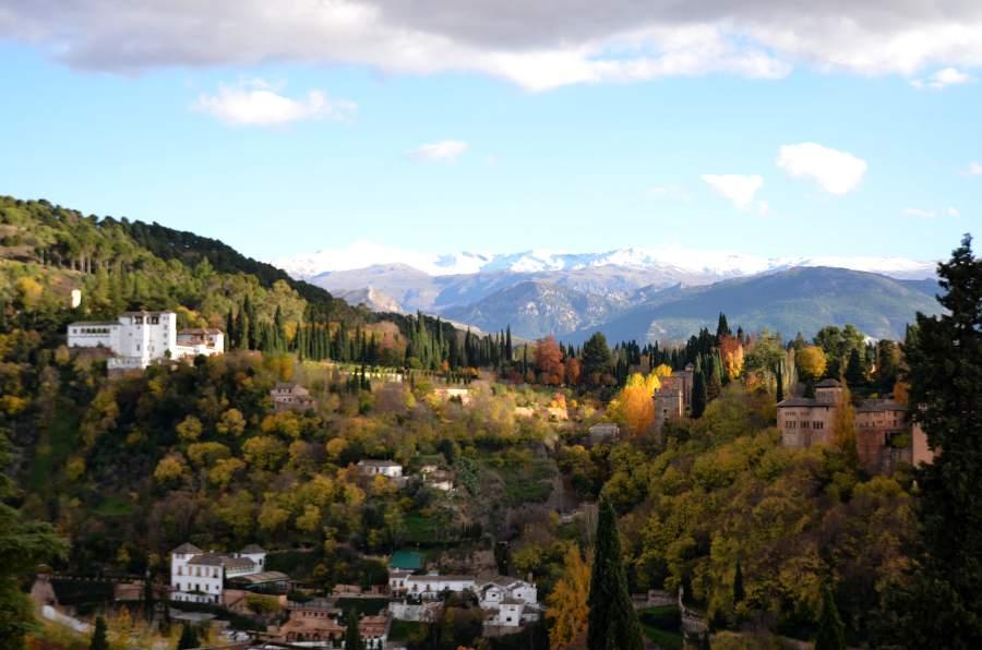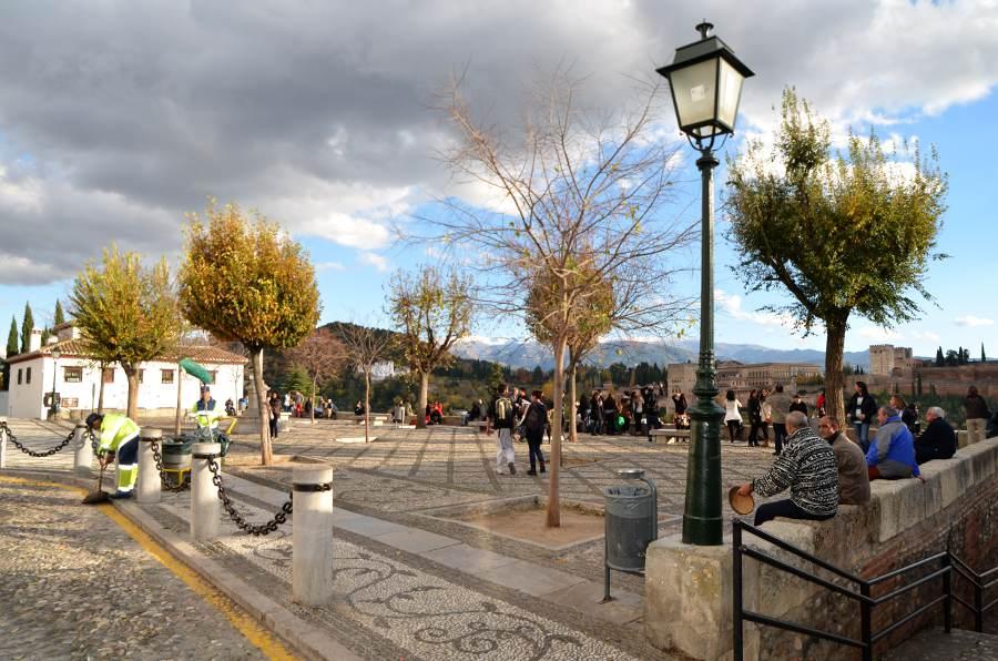 Plus haut encore, une place tout en longueur permet de profiter d’une vue magnifique sur la colline de l’Alhambra. Puis en se retournant, je ne peux qu’admirer les couleurs automnales des arbres qui viennent rehausser le jaune des boiseries des maisons environnantes. Quel spectacle !