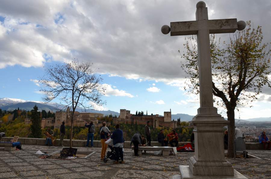 À force de tourner en rond, je finis enfin par trouver le mirador de la Plaza San Nicolas. C’est ici que se masse la foule des touristes… et des paumés de la ville. Cohabitation pacifique. On s’en fout, je suis là pour admirer la vue sur la colline de l’Alhambra.