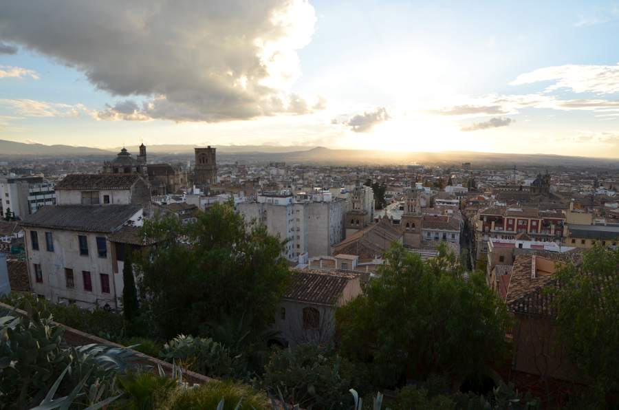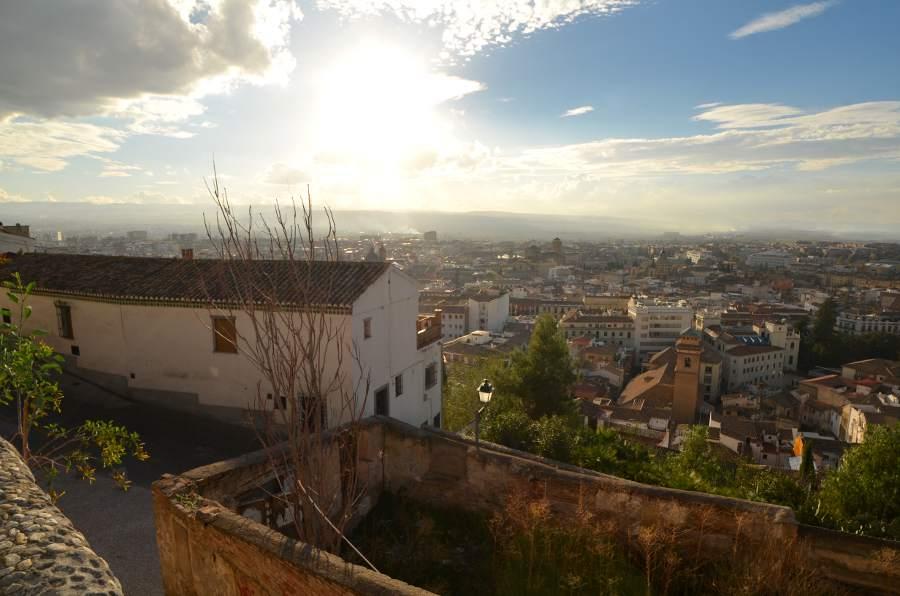 Les couleurs violentes de cette journée orageuse sont époustouflantes, allant de l’or sur les flancs de la colline, au blanc des cimes enneigées de la Sierra Navada au rouge vif des nuages transpercés de soleil. Paysage magique. Les murailles de l’Alhambra se dressent à l’horizon.