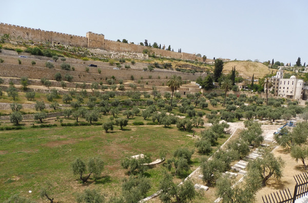 Retour dans la vallée du Cédron, au pied du Mont des Oliviers, au bas des remparts de la vieille ville. Un circuit sablonneux permet de circuler librement pour revenir tranquillement vers les portes sud de la cité trois fois sainte. Au creux de la vallée, on peut admirer les champs d’oliviers qui ont été plantés là, à deux pas du mont qui porte leur nom.