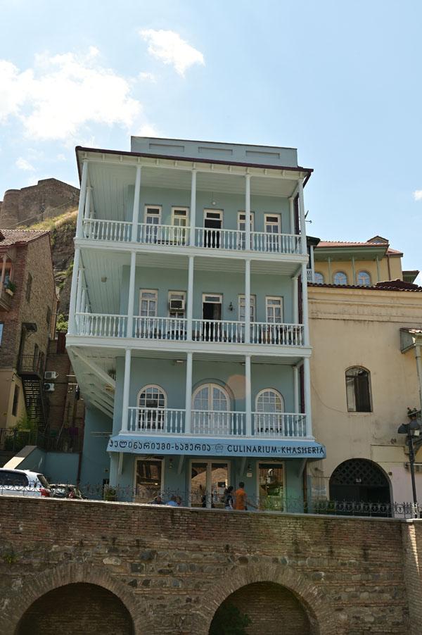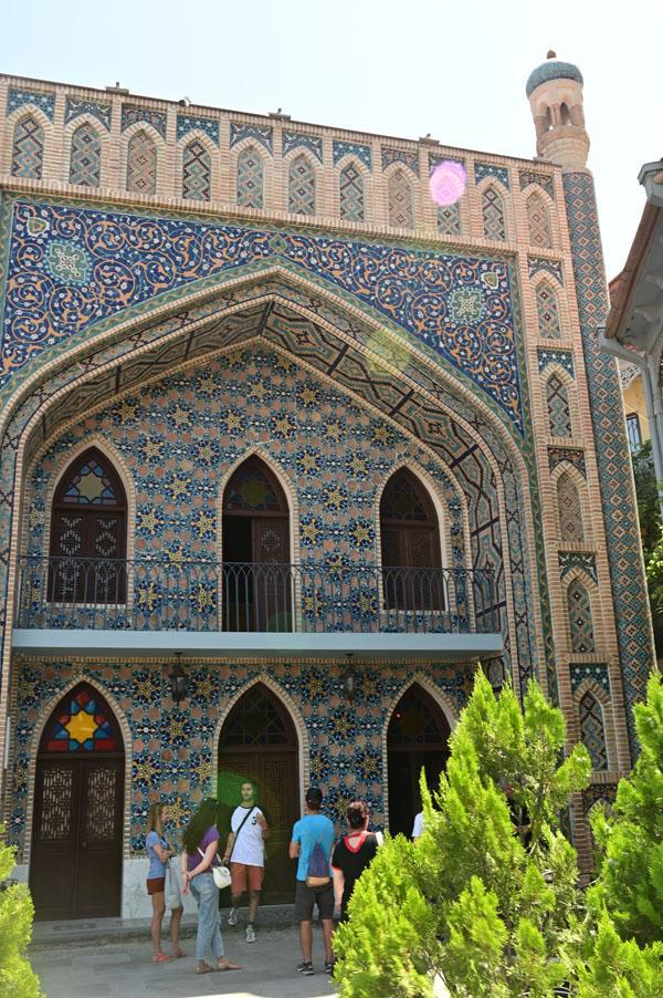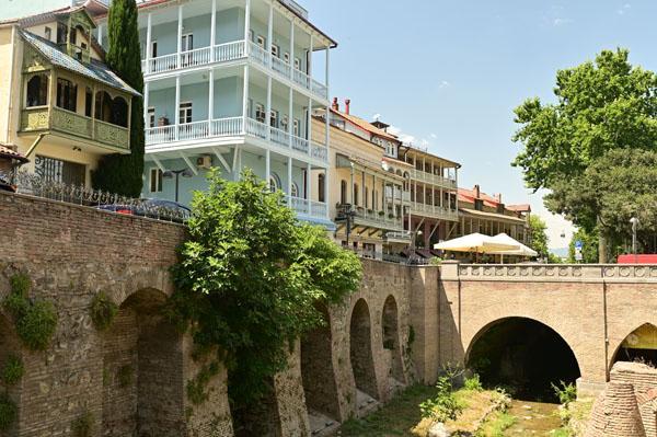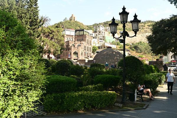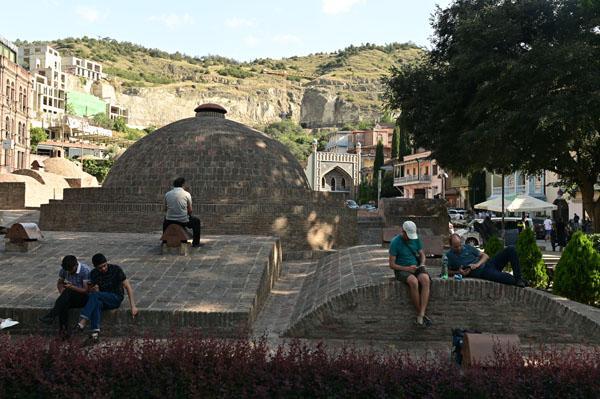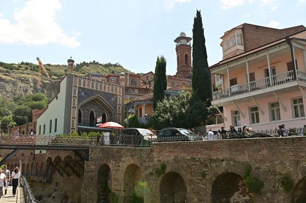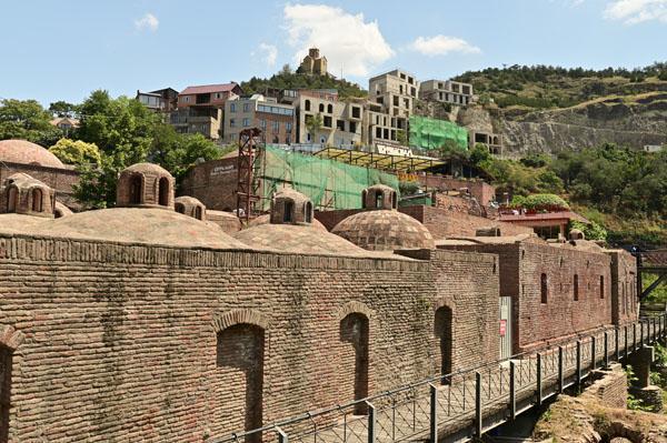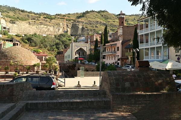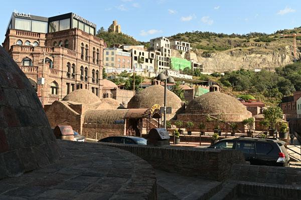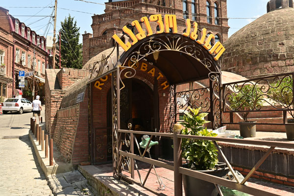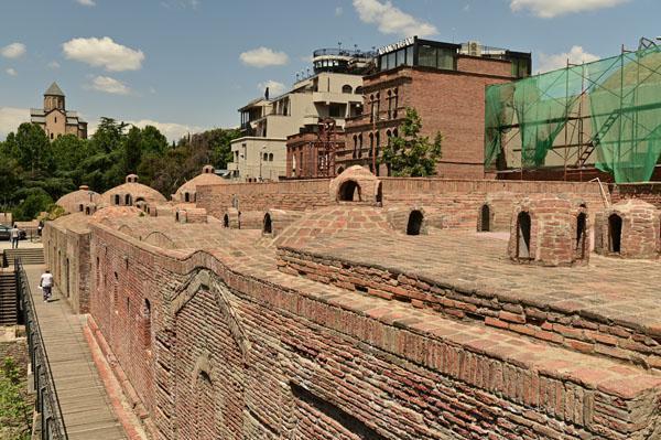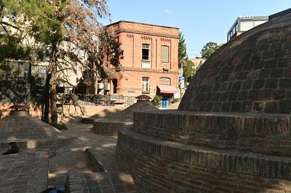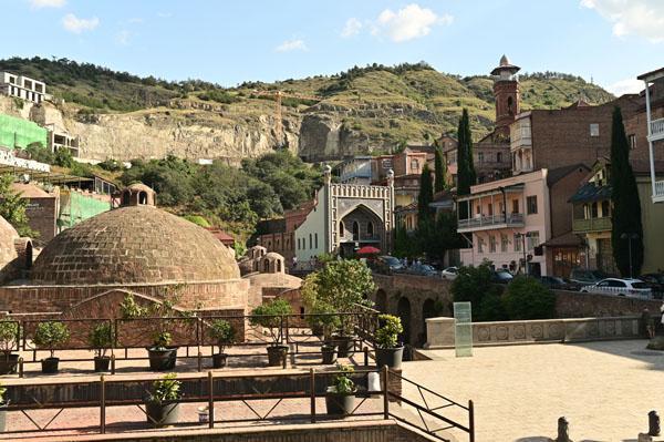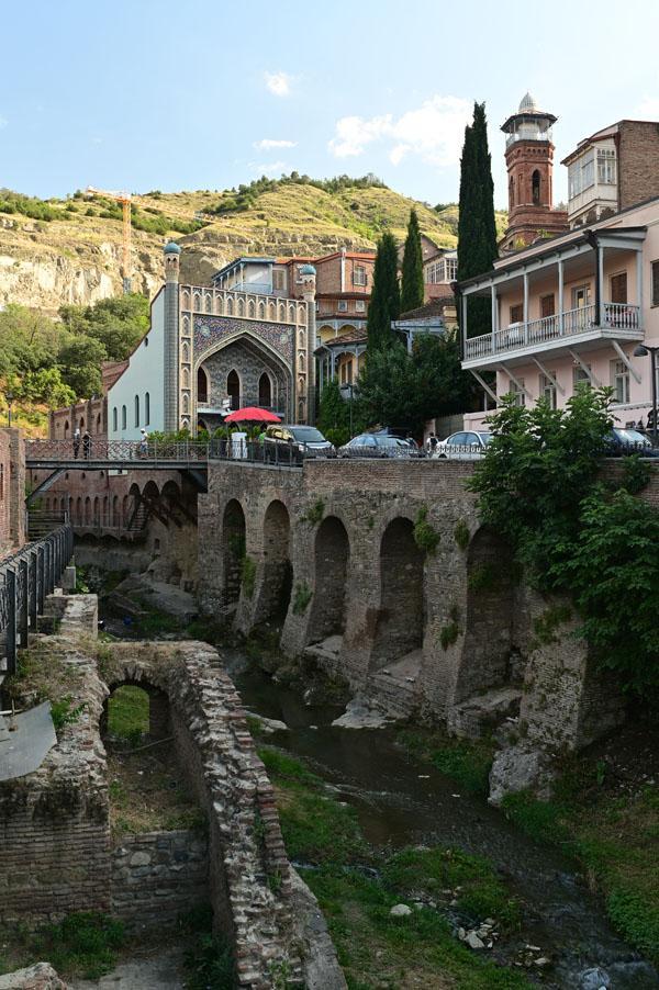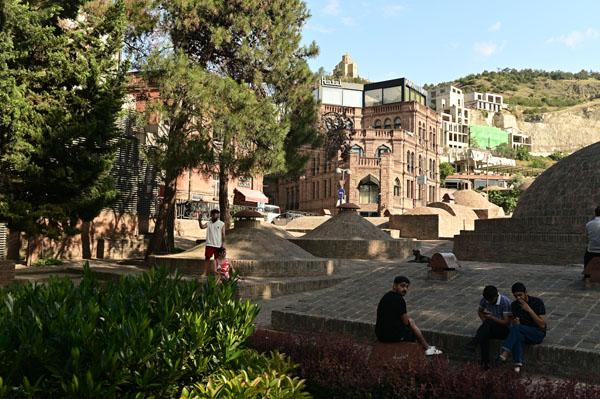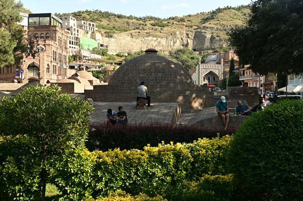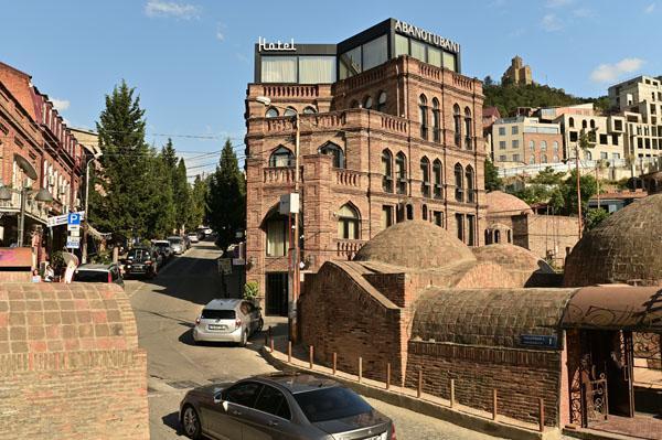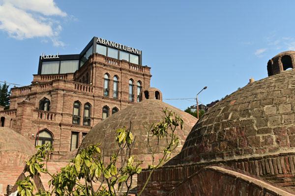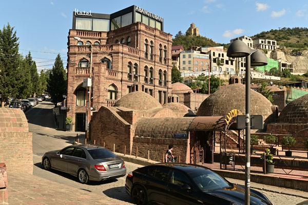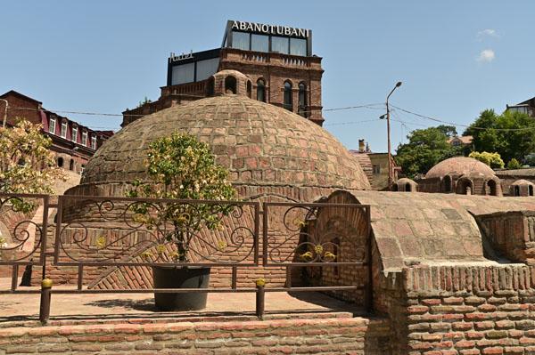 Abano, la rue des bains, conduit à l’insolite et splendide façade des bains Orbeliani-Tchreli (bariolé). Datée du XVIIIe siècle, elle évoque la splendeur des mosquées d’Ispahan de Chiraz, en Iran, de Kerbala, en Irak, ou encore de Samarkand. Ces thermes traditionnels sont alimentés par les sources d’eau chaude sulfureuse qui, selon la légende, seraient à l’origine de la fondation de Tbilissi. Elles furent célébrées par le géographe arabe Ibn Awqal au Xe siècle, Marco Polo, Alexandre Dumas et Pouchkine.