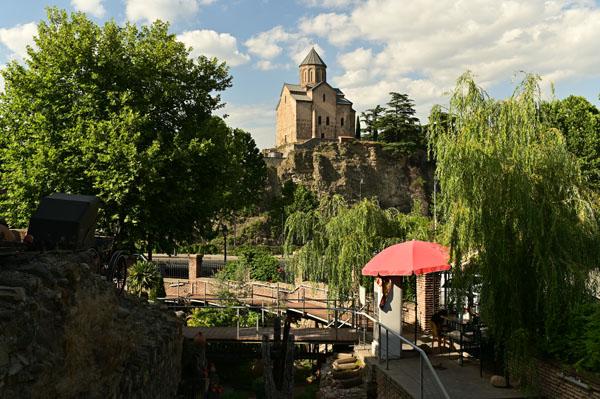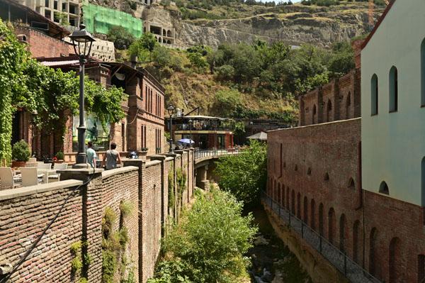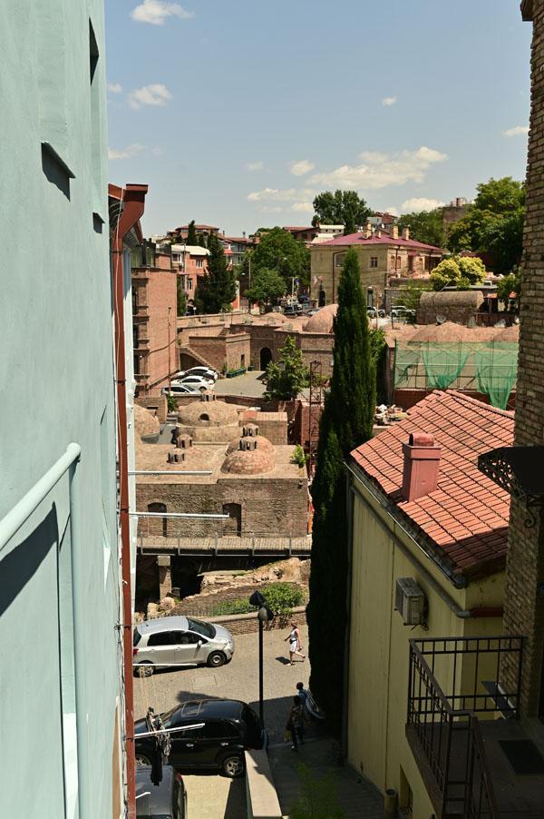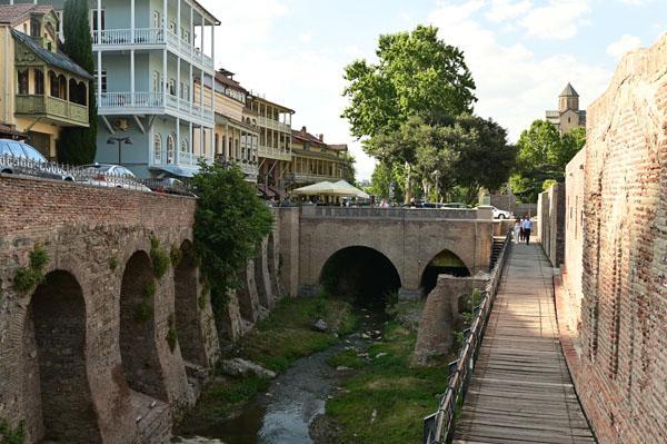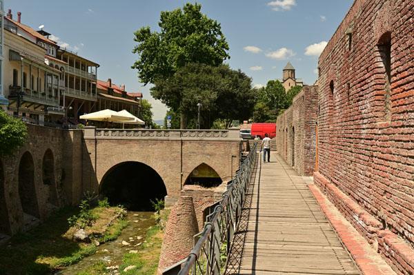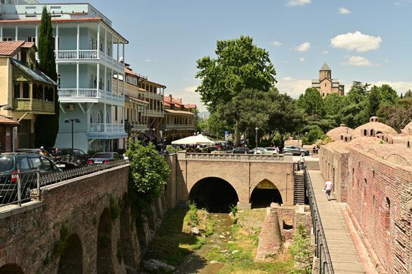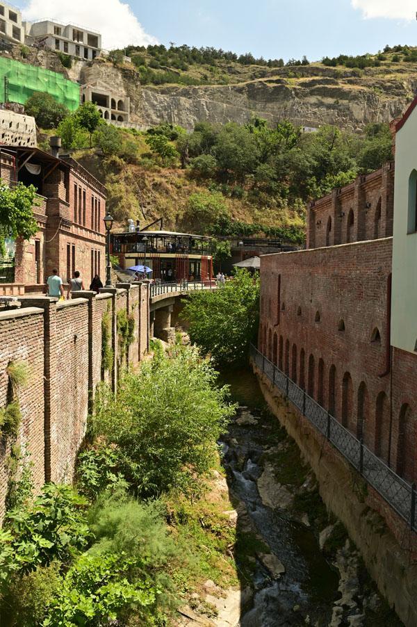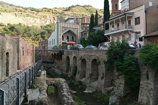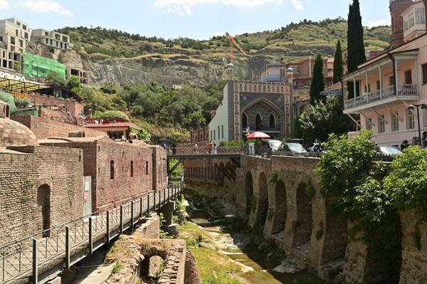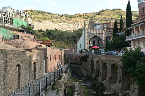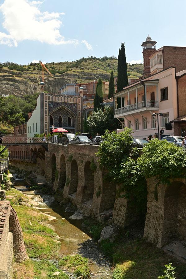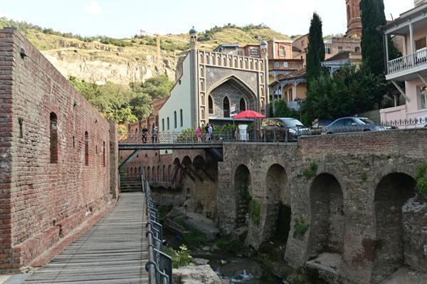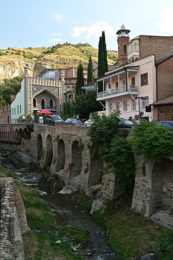 L’intérêt de se promener dans le quartier des bains turcs, c’est aussi d’accéder à la plus belle vue que l’on peut avoir sur Tbilissi. Depuis un petit pont, on a une vue dégagée, absolument magnifique, sur cet ancien quartier de la ville, un des plus vieux de la ville, depuis lequel on peut voir le lit de la rivière (asséché hélas), les piles des ponts, les fondations des maisons pluri-centenaires, et au fond, l’iwan d’une ancienne mosquée turque.