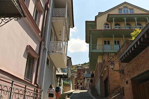 Partir à la découverte de Tbilissi, c’est comme remonter le cours du temps à bord d’une machine qui se serait complètement déréglée. On ne sait plus d’où l’on vient, où on va, à quelle époque, tellement les styles architecturaux s’entrechoquent. La rue montante qui longe le quartier d’Abanotubani en est le plus bel exemple : d’un côté les vieilles maisons en briques crues, de l’autre des façades plus européanisantes.