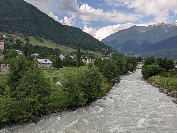 Dimanche 10 juillet. Retour à Mestia. Il est encore tôt et ma fille traîne encore dans sa chambre. Du coup, je vais aller faire un petit tour en solo dans la ville, histoire de me dégourdir les jambes.