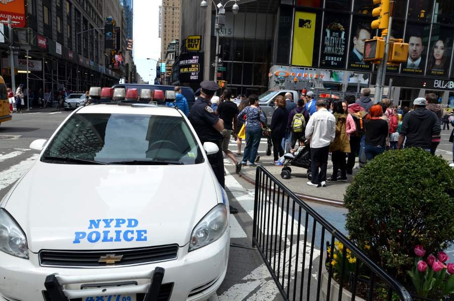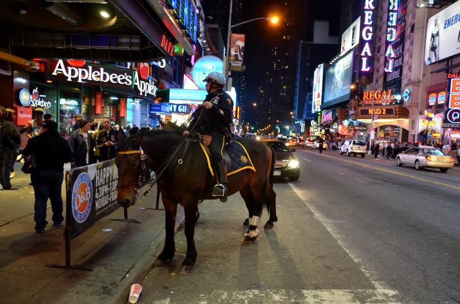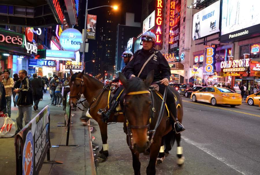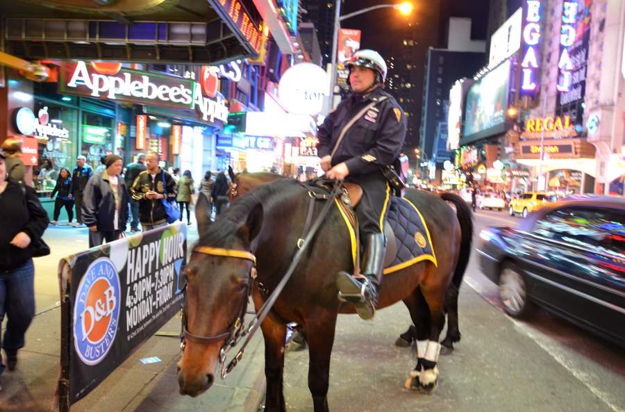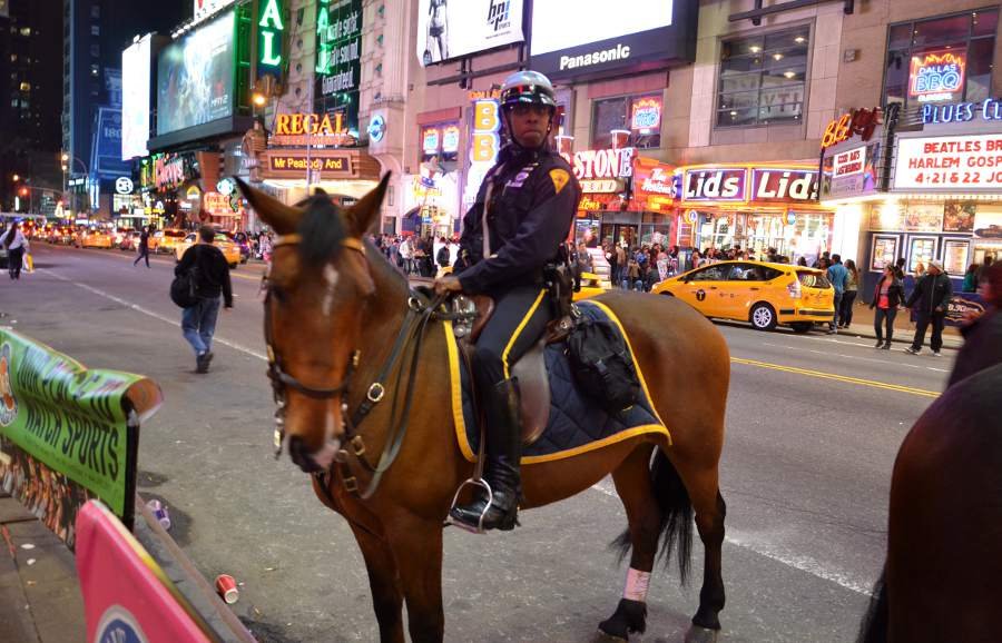 Après cette douche froide (ce ne sera pas la dernière…), de retour à Times Square. Petit coup d’oeil sur la police montée qui veille au grain sur l’artère la plus fréquentée de New York. On peut même caresser le chanfrein des chevaux. Cool !