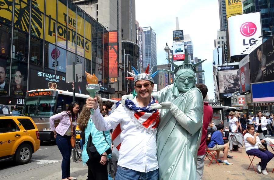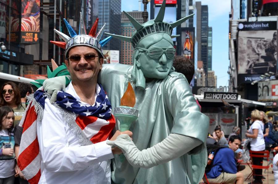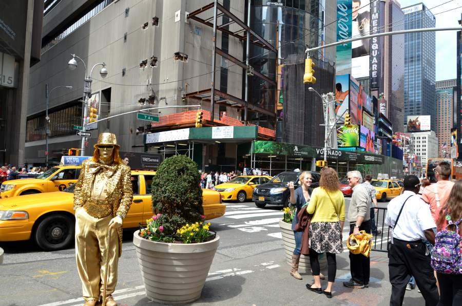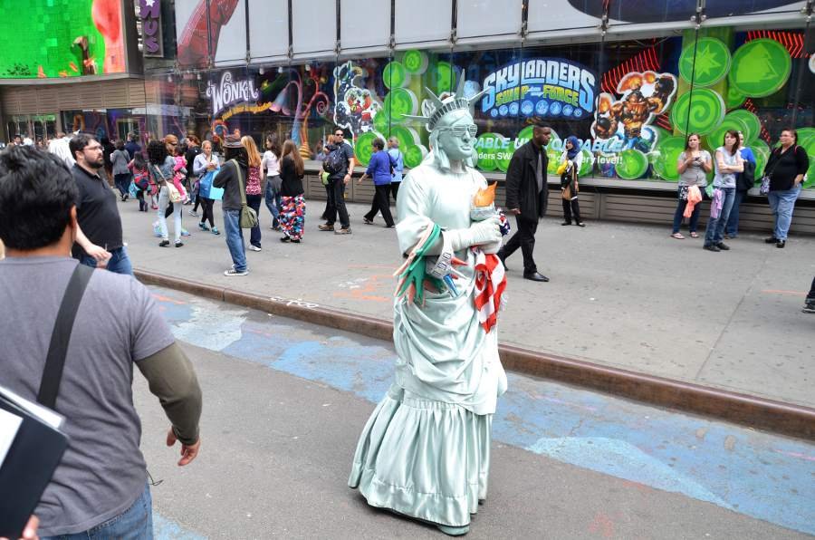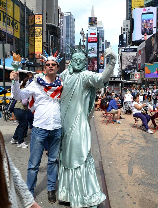 Attablé en plein milieu de Times Square, on assiste au spectacle. « Tu vois, ma p’tite Aurélie, si tu ne sais pas quoi faire et que tu ne veux pas rentrer en France… » Mais le meilleur reste à venir. ça fait au moins un bon quart d’heure que j’ai repéré « l’homme – statue de la liberté » qui se fait prendre en photo avec les touristes de passage.