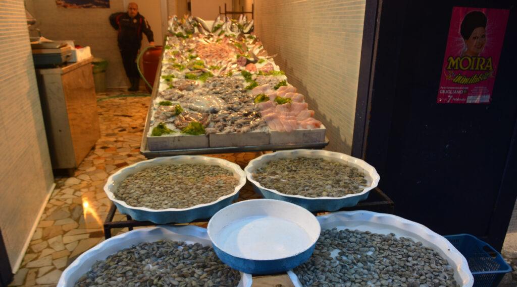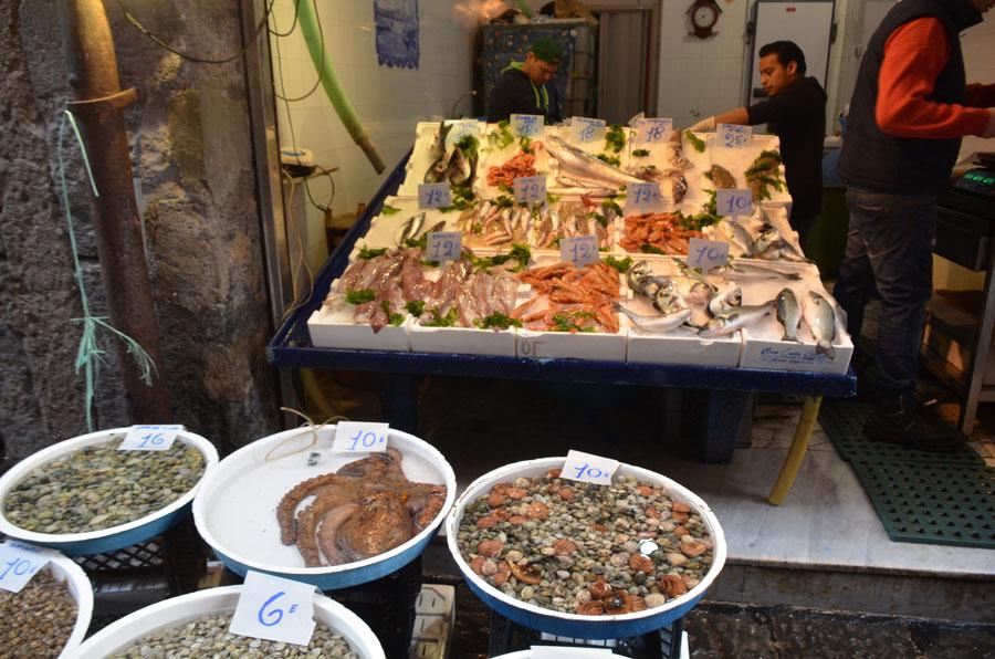 Dimanche 7 février. Ce matin, réveil en douceur… La nuit a été courte. La clé de la porte d’entrée a encore fait des siennes, et du coup on a failli passer encore la nuit dehors ! Ce matin, petit-déjeuner tranquille, puis on remonte les quartiers populaires autour du duomo, en direction du musée archéologique. C’est là que se noue le drame. Au hasard de la Via Tribunali, je tombe nez à nez avec Paul le poulpe. Ici, les poissonneries sont foisons. Mais quand même… Il me fait trop de la peine, ce gentil Poulpe.