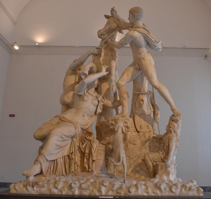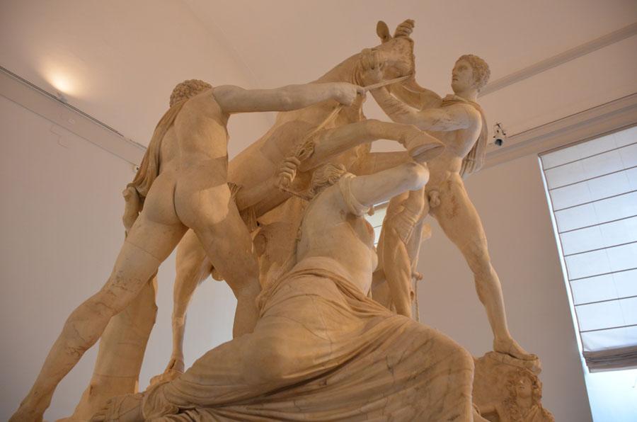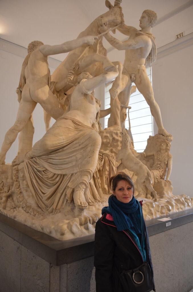 Et c’est encore dans les thermes de Caracalla que fut exhumé en 1545 l’extraordinaire taureau Farnèse, pièce maîtresse du musée. Ce chef-d’œuvre évoque l’atroce supplice de Dircée, une légende de la mythologie grecque. Cette composition colossale du IIIe siècle réalisée d’après une œuvre grecque fut découverte à l’état fragmentaire, puis fut reconstituée. Si réputée qu’elle était déjà mentionnée à l’antiquité dans “L’Histoire naturelle” de Pline l’ancien. Réalisée dans un seul bloc, elle aurait été retouchée à la Renaissance par Michel Ange en personne… Pour la petite histoire, elle fut escortée par un navire de guerre lors de son transfert à Naples en 1788 !