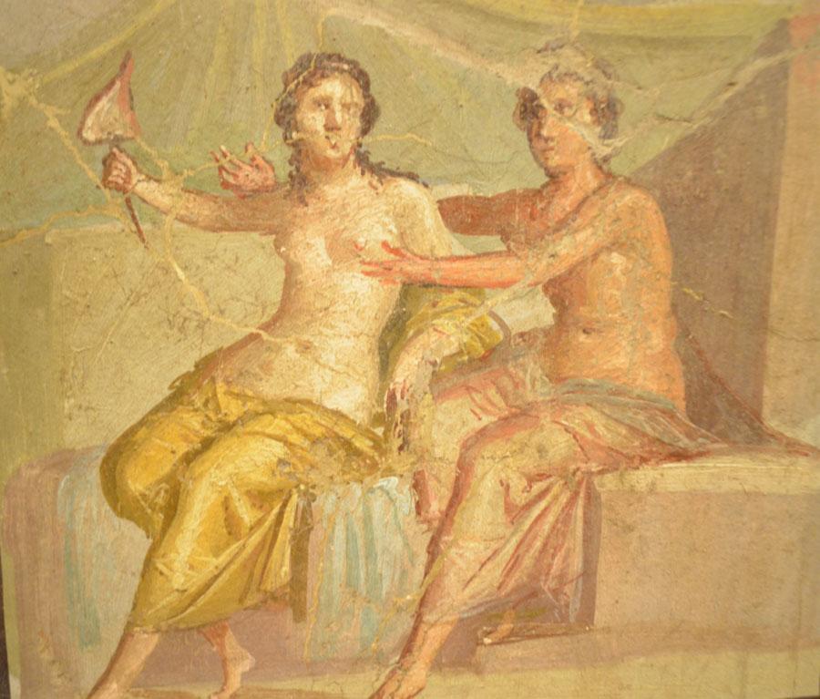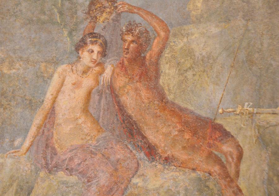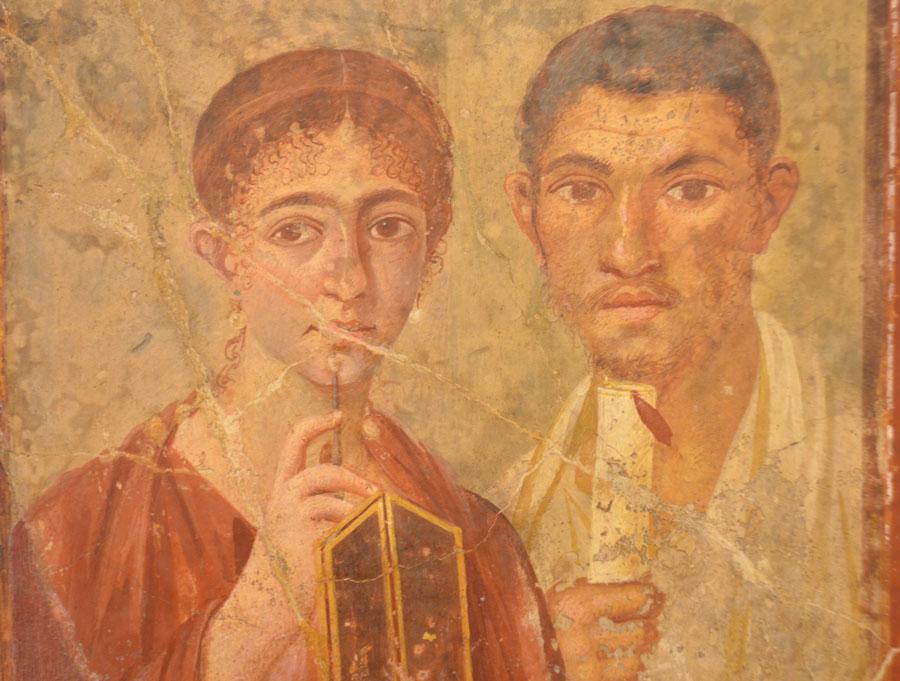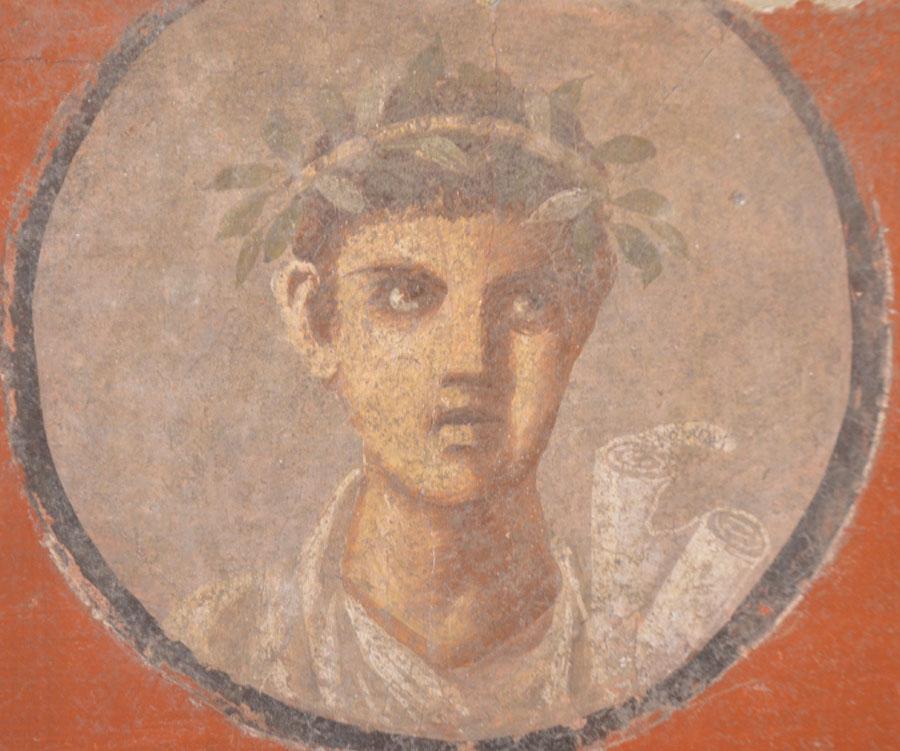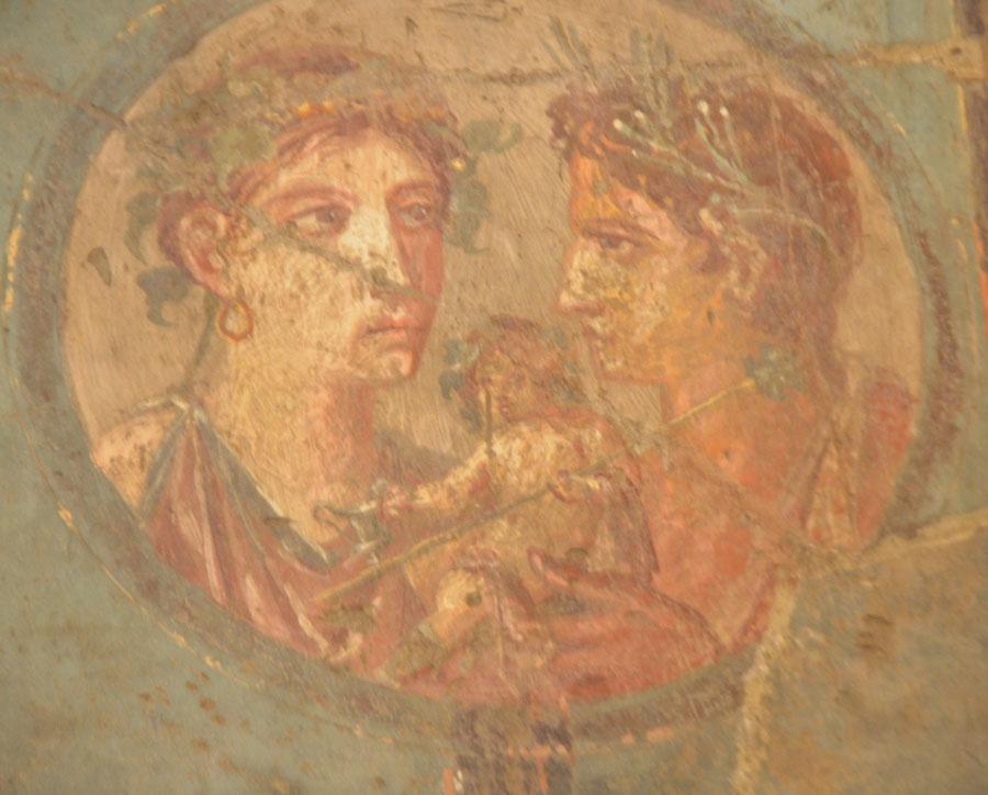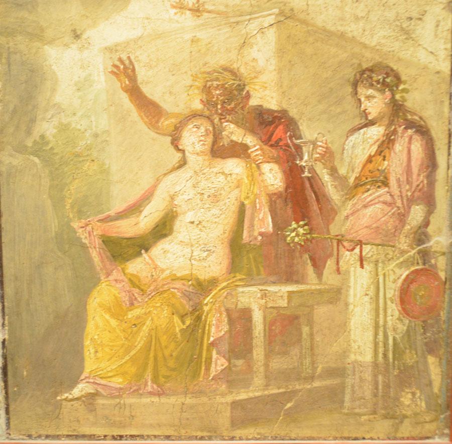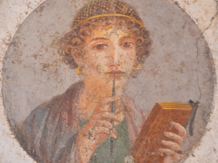 Enfin on achève la visite par les salles consacrées aux peintures et fresques retrouvées à Pompéi : les portraits de Tarentius Neo et de son épouse. La femme tient un stylet et une tablette. À ne pas manquer non plus Sapho, dans une peinture en médaillon, représentée dans une pause songeuse et lascive.