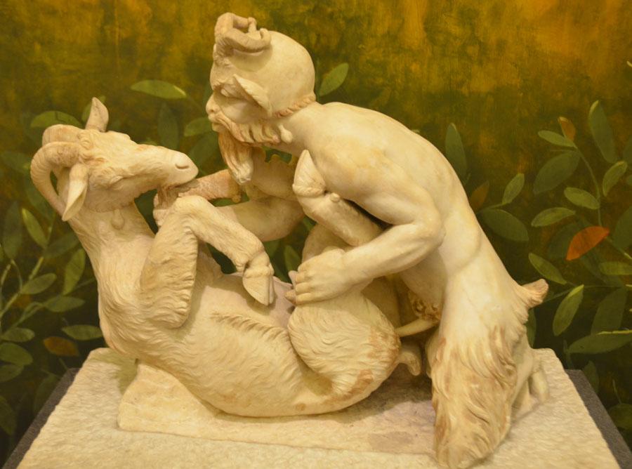 Les œuvres exposées étaient utilisées à des fins initiatiques, mais également religieuses. On y voit même une sculpture du dieu Pan s’accouplant avec une chèvre en la tenant par la barbichette ! Découverte dans la villa des Papyrus, à Herculanum, elle fut la plus censurée de la collection, longtemps enfermée dans une armoire où, seul, le roi de Naples avait le droit de la voir !