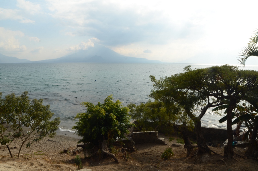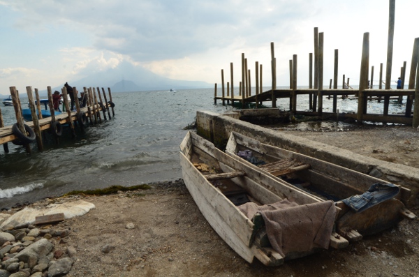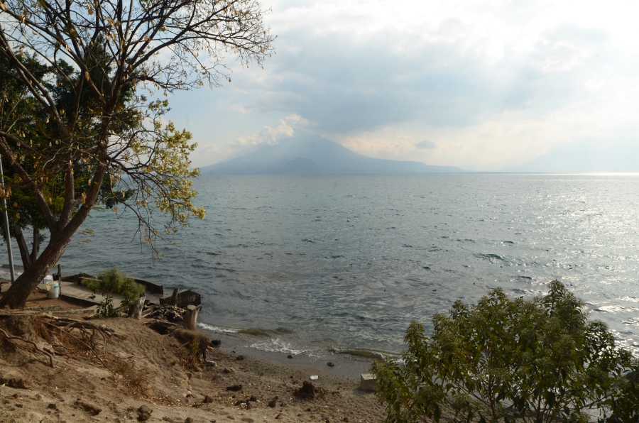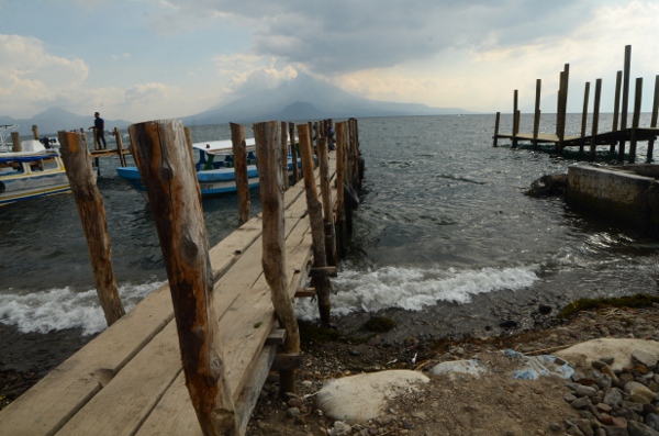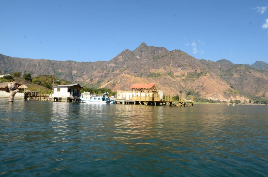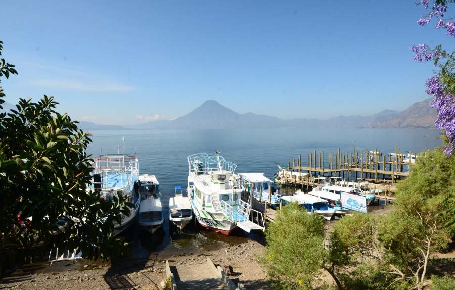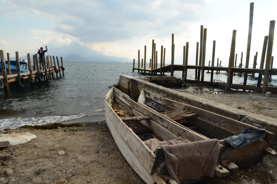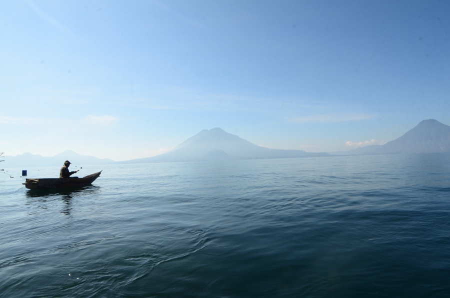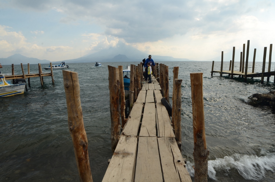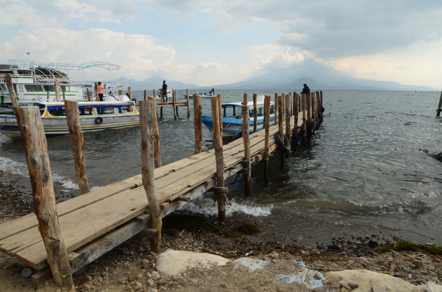 Des jetées en bois s’élancent sur les eaux bleues du lac. De la brume, au loin, émergent les trois volcans qui entourent le lago Atitlan.