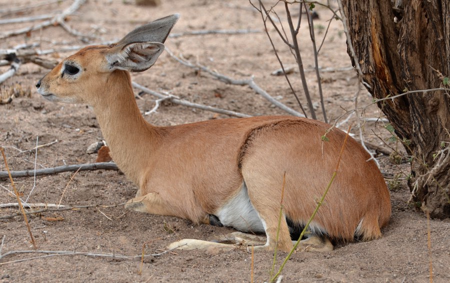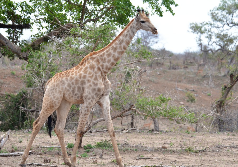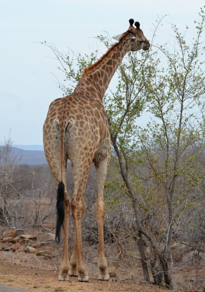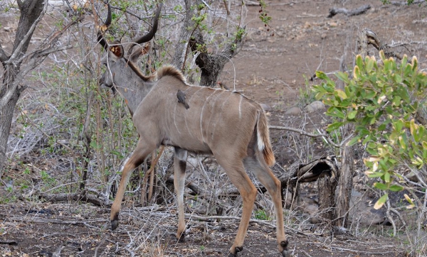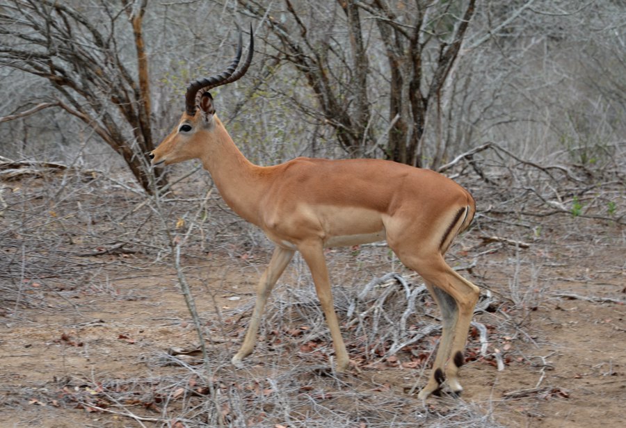 Impossible de traverser le parc Kruger sans tomber nez à nez avec des antilopes (pas des gazelles, les antilopes appartiennent à la famille des bovidés). Et le premier d’entre eux que nous croisons est ce magnifique mâle grand koudou, sans doute la plus majestueuse des antilopes africaines. On le reconnaît aisément à sa petite bosse sur le dos et à ses lignes blanches verticales qui strient son poitrail. Ce mâle est encore jeune, ses cornes torsadées sont encore petites… Elles peuvent atteindre jusqu’à un mètre !