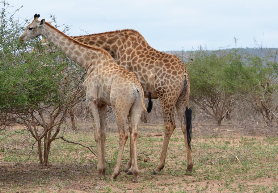 Aujourd’hui, nous avons la chance avec nous. Nous verrons deux espèces de girafes : la girafe réticulée et la girafe de Rothschild. La robe de la première est d’un brun foncé, ses tâches sont très régulières et imitent un motif d’écailles de tortue. La deuxième est identifiable car elle n’a pas de tâches au-dessous des genoux (chaussettes blanches).