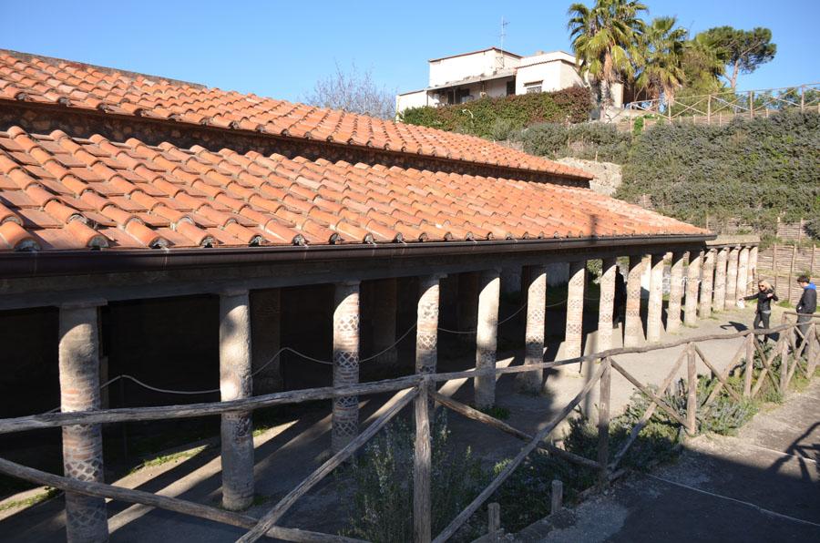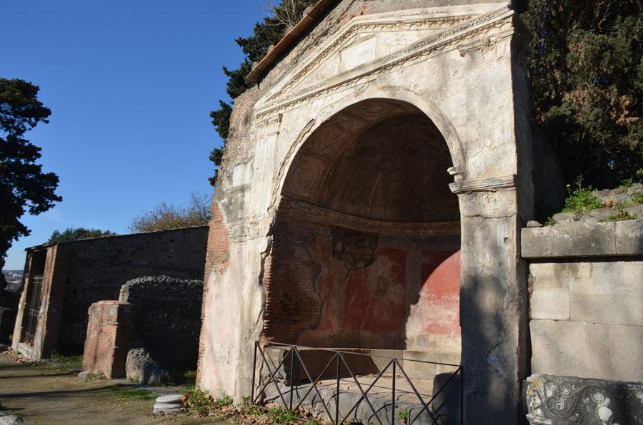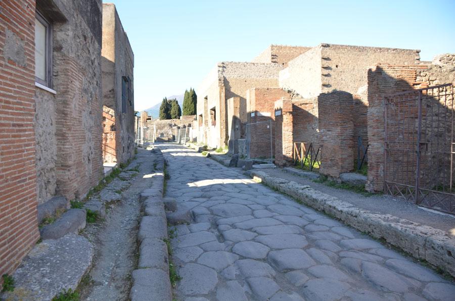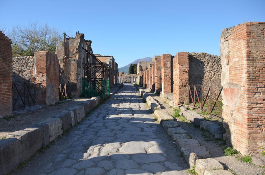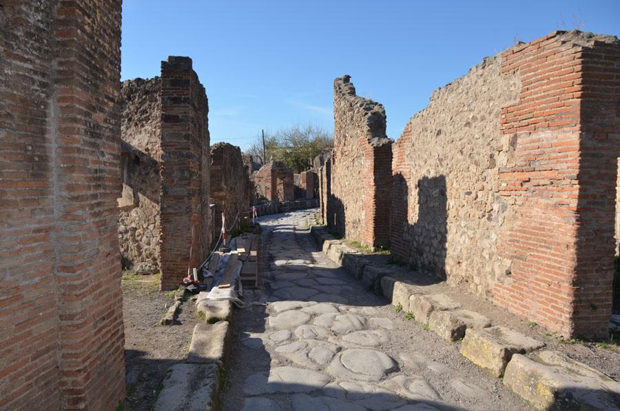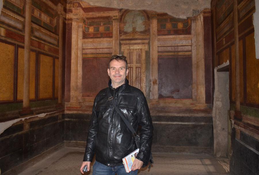 Samedi 6 février. Après le forum, on file droit vers le nord-ouest de la cité. C’est là, à l’extérieur de l’enceinte antique que se dresse la villa dei Misteri, la villa des Mystères***, le plus bel édifice de Pompéi. Il est déjà tard et il faut aller à l’essentiel. Cap au nord donc ! Du coup, on remonte la voie romaine bordée d’anciennes maisons, de fontaines et de la Casa del Poeta tragico* avec sa mosaïque et sa superbe fresque à sujet mythologique. On s’amuse également avec les cuvettes des lattrines… qui n’en sont pas ! Ce sont les cuisines où l’on disposait les plats !