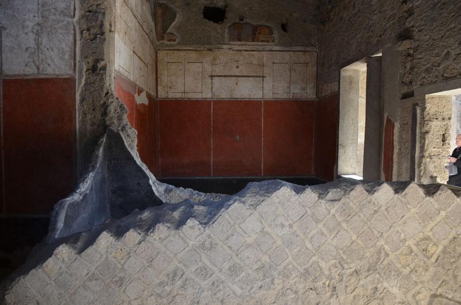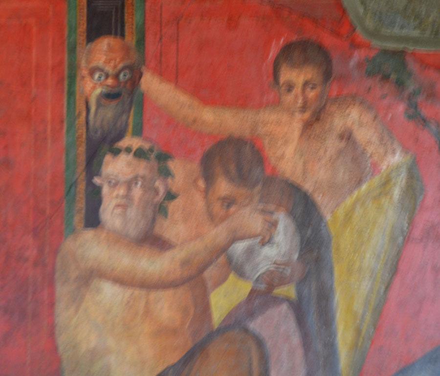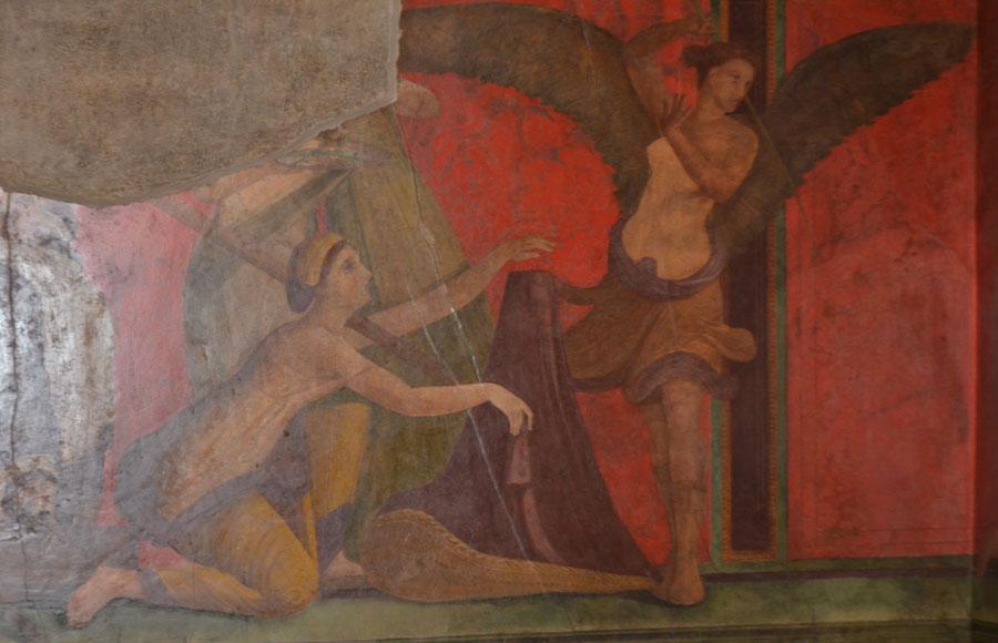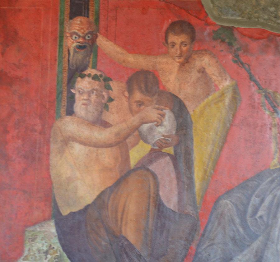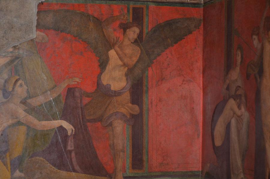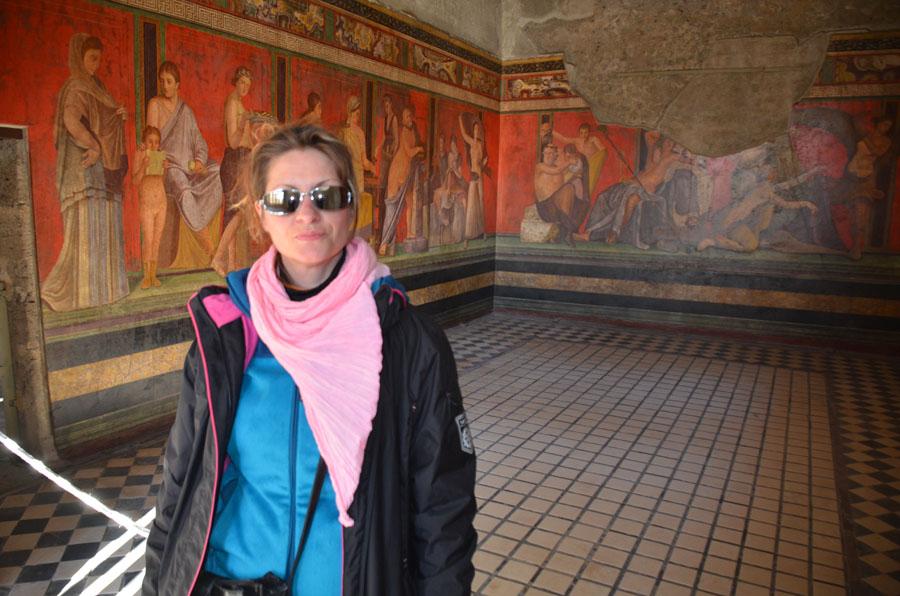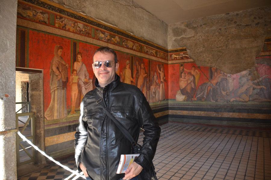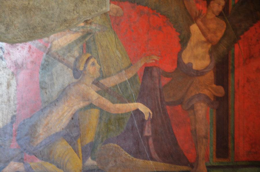 Au bout de la voie romaine enfin surgit la Villa dei Misteri***, vaste maison patricienne autrefois bâtie au bord de la mer. Dans un excellent état de conservation, la villa des Mystères semble avoir traversé le temps sans aucun dommage… Si l’éruption du Vésuve fut une des plus grandes catastrophes de l’Antiquité, on comprend aussi pourquoi elle fut aussi une chance archéologique aux yeux des savants. Ce linceul de cendres permit de conserver intact une grande partie de la cité romaine pendant 17 siècles ! Dont cette fameuse Villa dei Misteri.