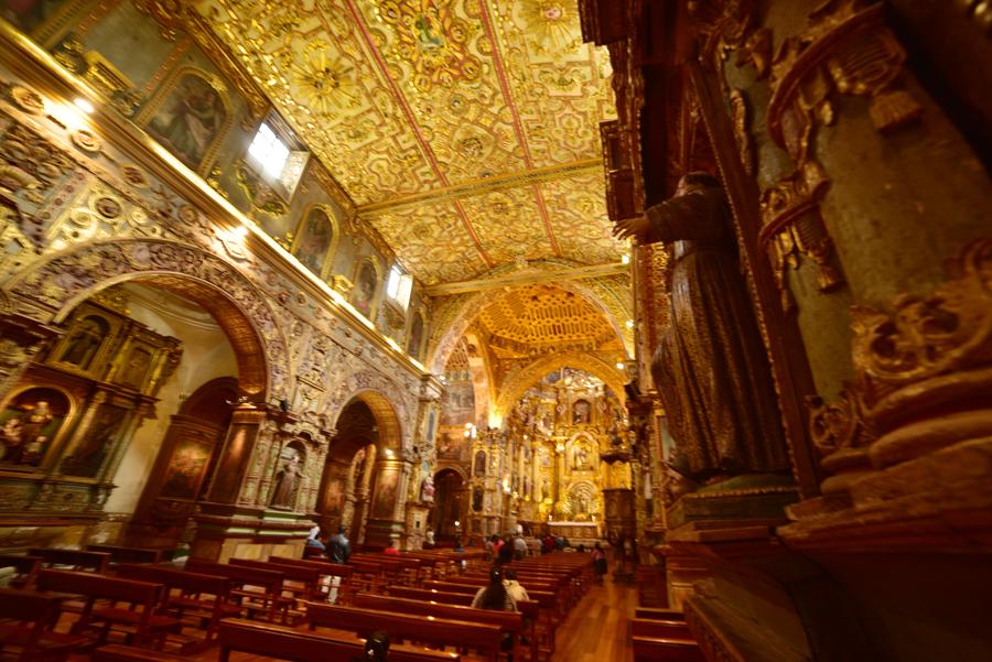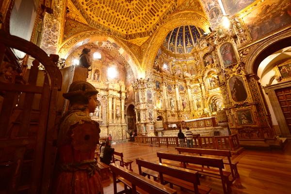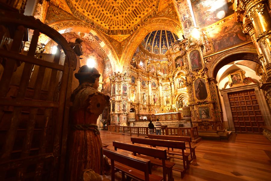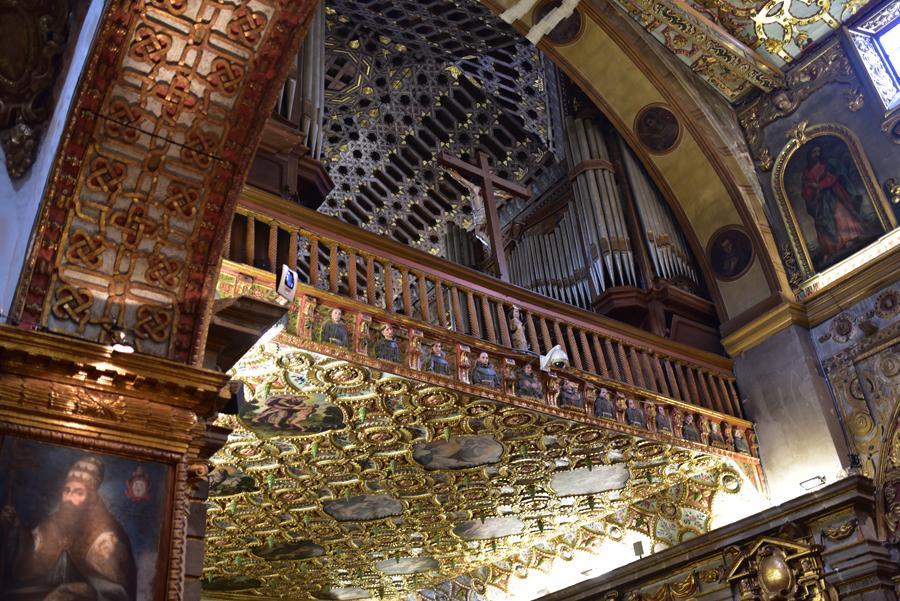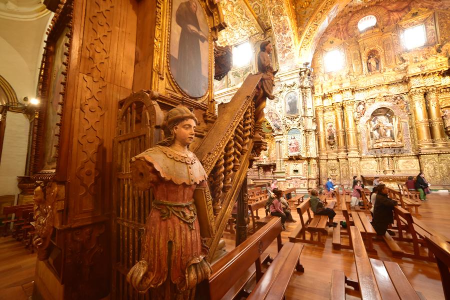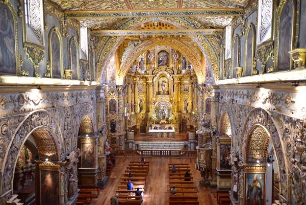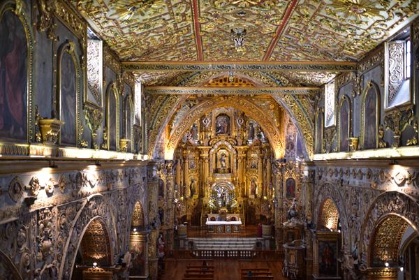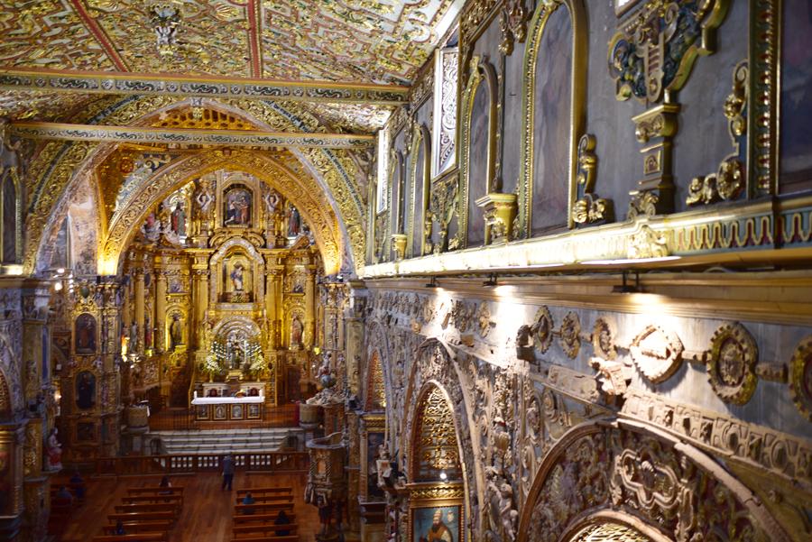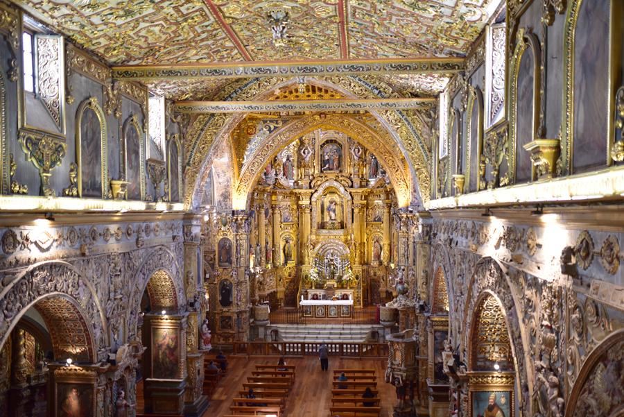 Voûtes, arches et piliers de la nef rivalisent eux aussi d’audaces, richement décorés et sculptés, amorçant la transition entre l’art mudéjar hérité de la reconquête espagnole et le baroque flamboyant financé par l’or des Incas.