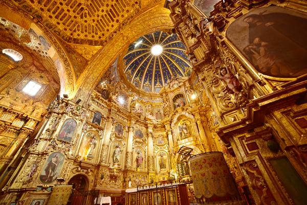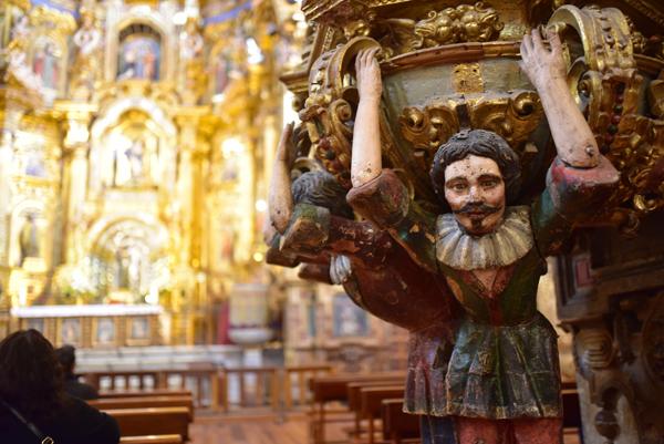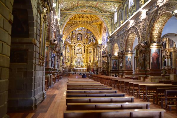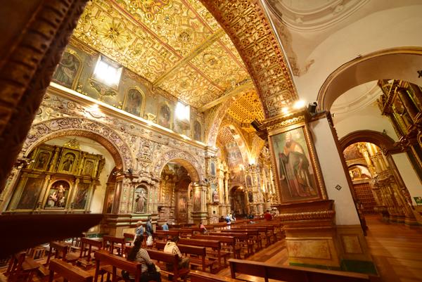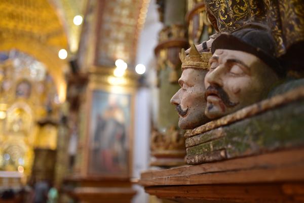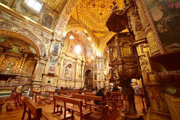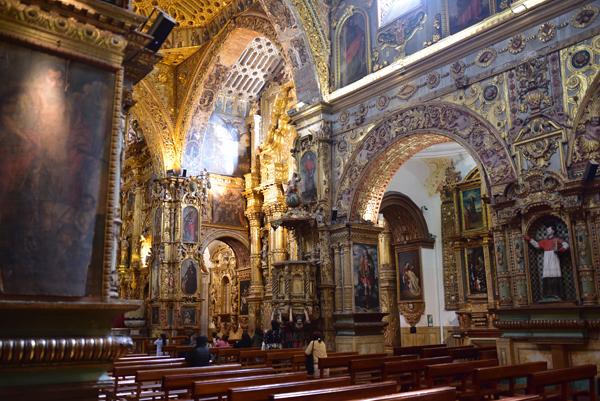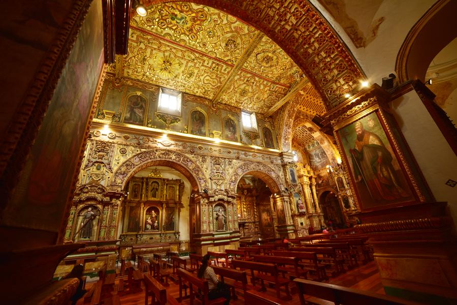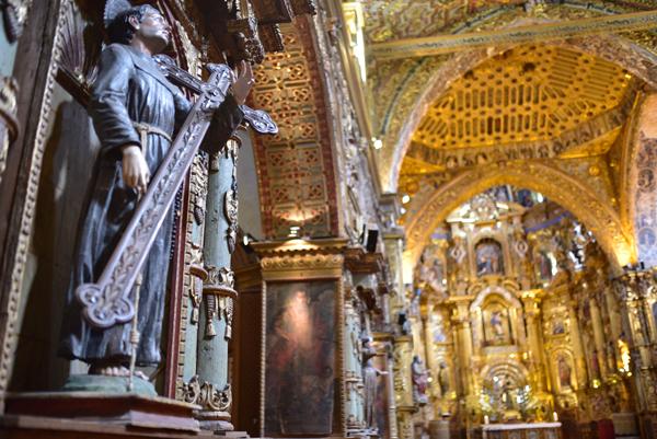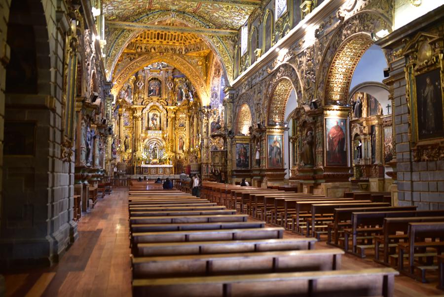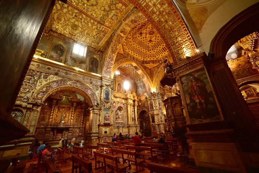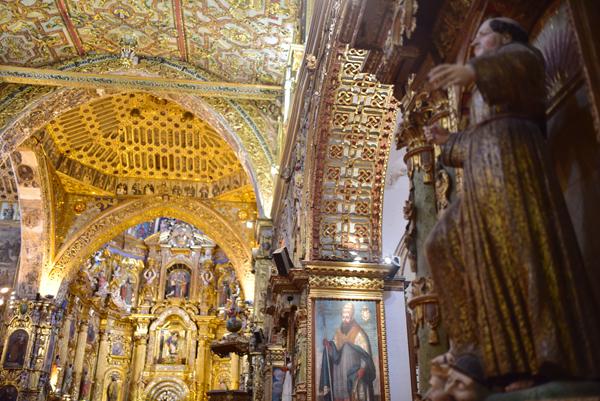 Voûtes, arches et piliers de la nef rivalisent eux aussi d’audaces, richement décorés et sculptés, amorçant la transition entre l’art mudéjar hérité de la reconquête espagnole et le baroque flamboyant financé par l’or des Incas.