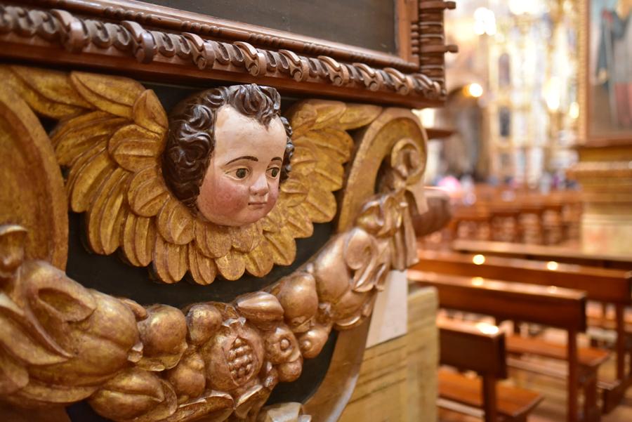 À peine entré dans l’église, on est aussitôt ébloui par les dorures, les sculptures, les moulures et autres fresques qui ornent la nef et les chapelles. Étourdissant de beauté.