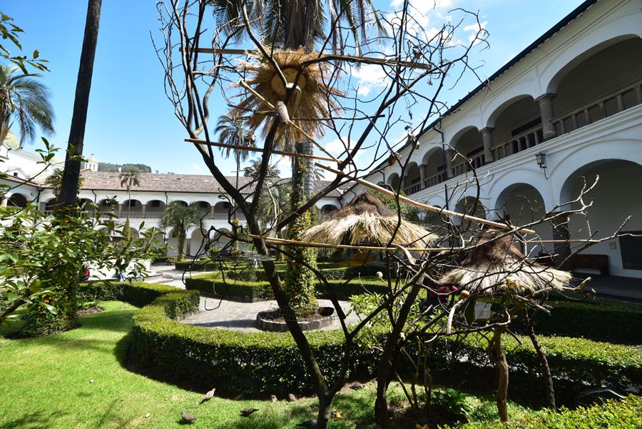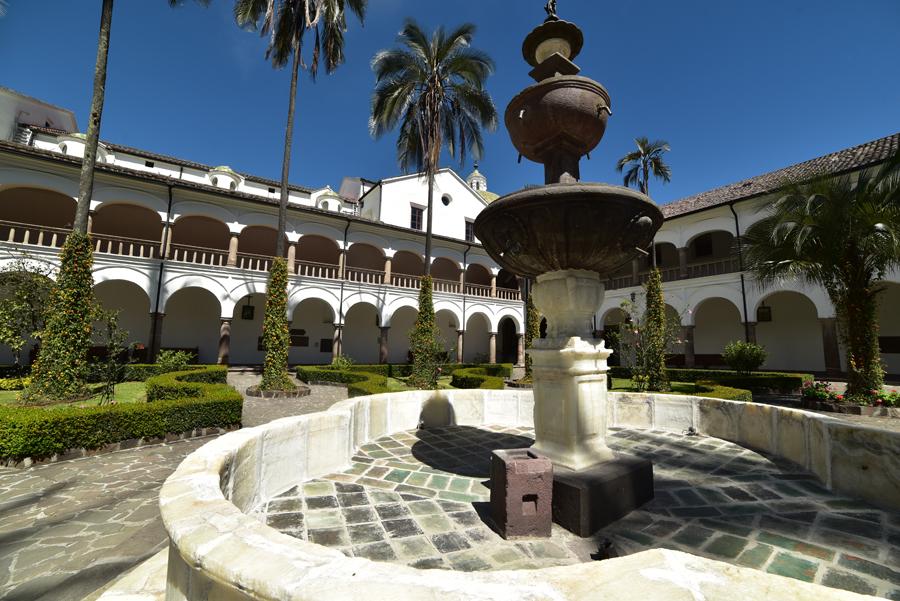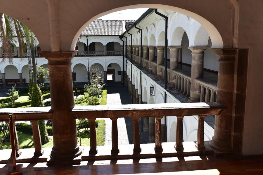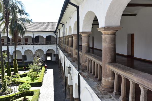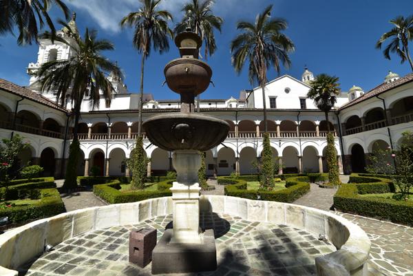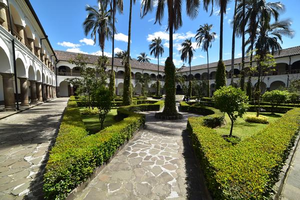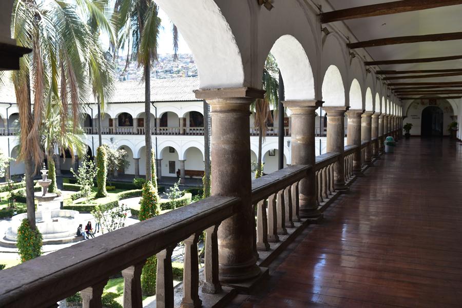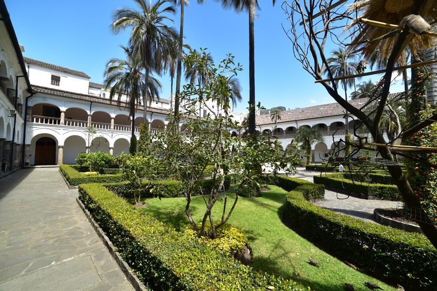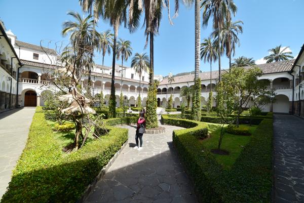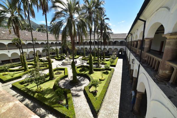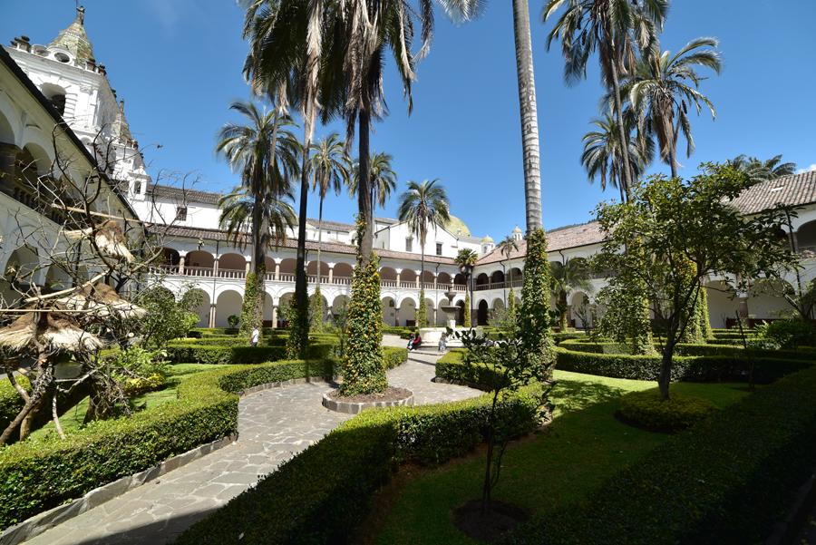 Retour au centre du monastère San Francisco. Un magnifique cloître permet la circulation entre les différents bâtiments du couvent. Parterre hérissé de palmiers.