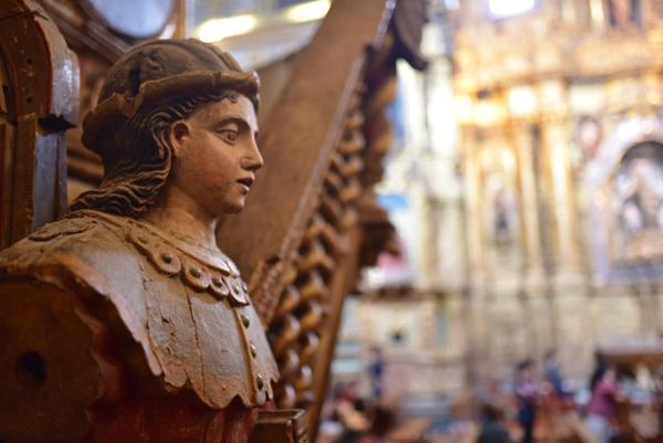 En levant la tête, le spectacle est éblouissant, une coupole étoilée surplombant la nef ornée d’une dentelle de style mudéjar, tandis que le chœur offre un festival de portraits, retables richement décorés et colonnes de styles différents.