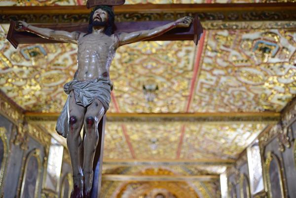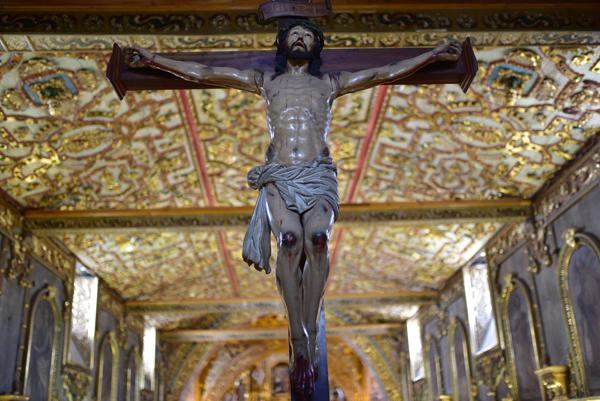 Un immense Christ en croix domine le balcon qui donne sur la nef. Sa simplicité, sa force évocatrice tranche avec l’exubérance de la décoration intérieure de l’église.