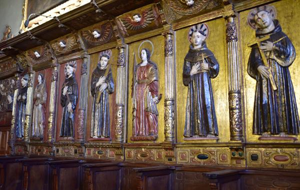 Voici une vue d’ensemble des stalles, chapeautées par des tableaux représentant les grandes figures de l’ordre Franciscain.