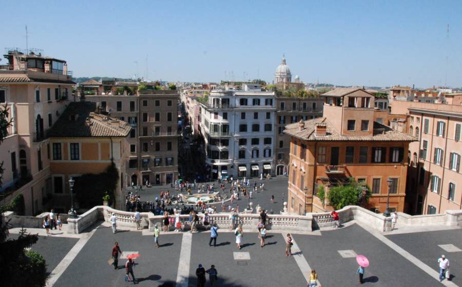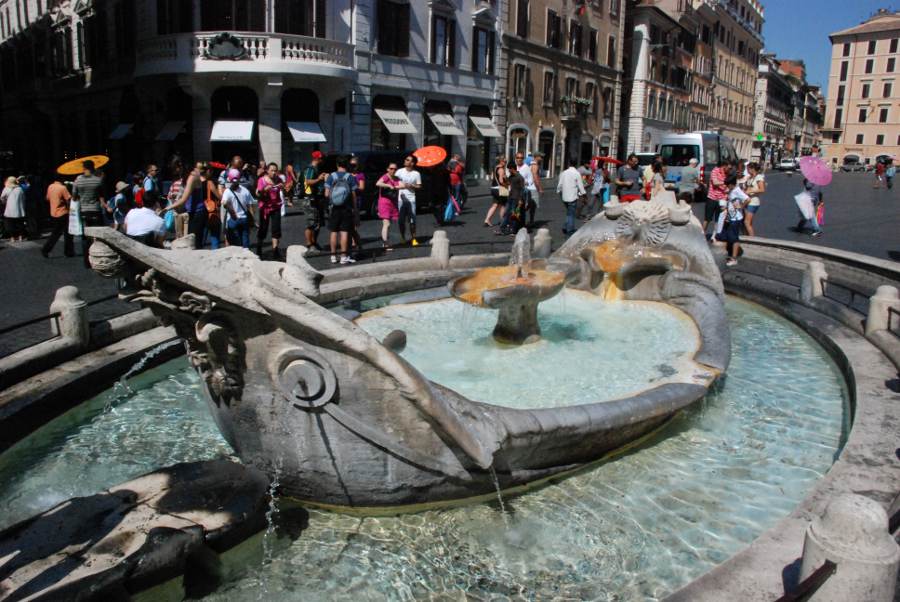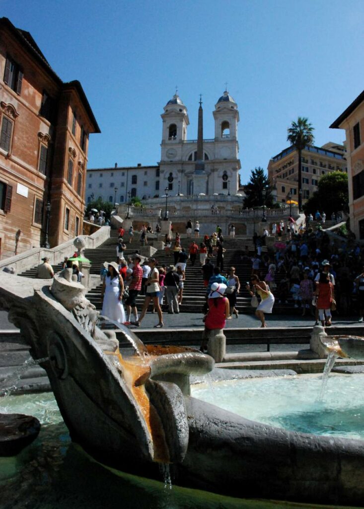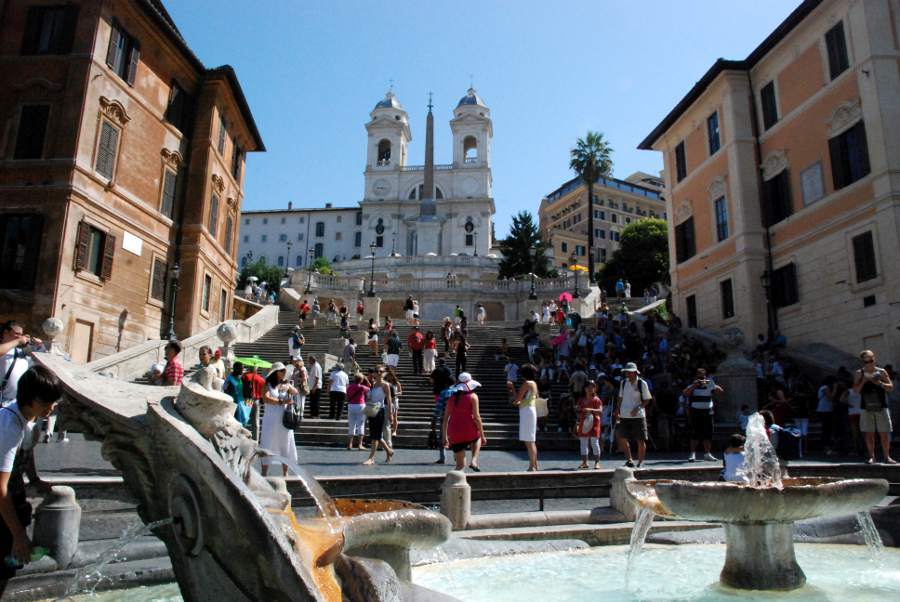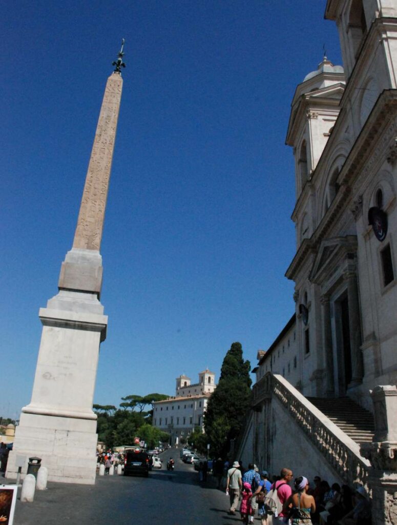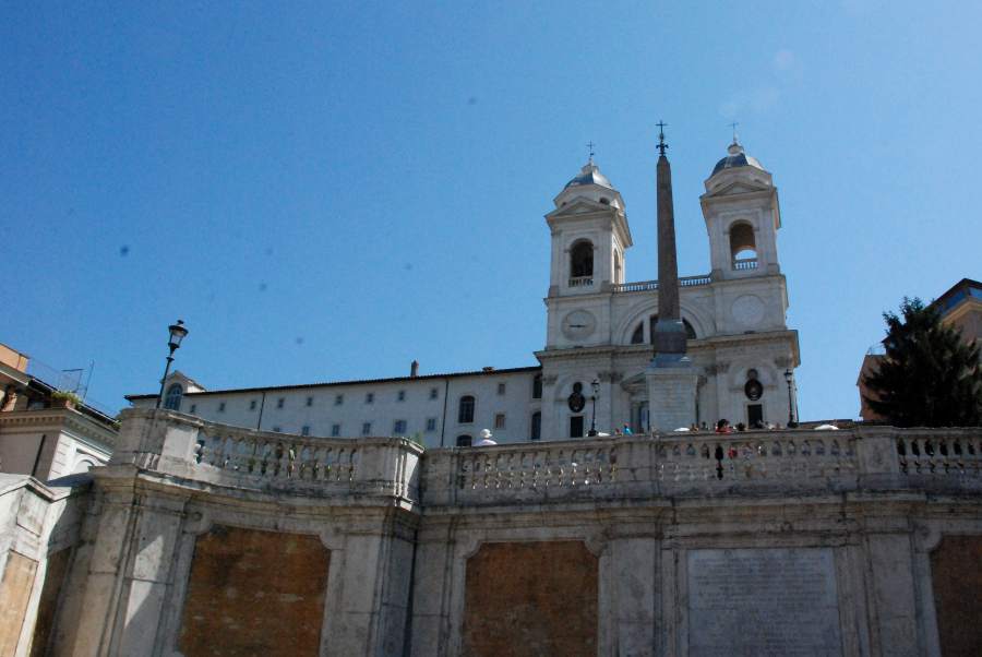 Sur la place, au pied des 137 marches qui mènent jusqu’à l’église, une fontaine en forme de barque est prise d’assaut par les touristes… Pour la petite histoire, l’idée vint au Bernin suite à une inondation gigantesque qui noya la place sous huit mètres d’eau en 1598… et qui fit échouer une embarcation sur les flancs de la colline du Pincio ! Il faut encore escalader les célèbres marches du Scale di Spagna, inaugurées en 1727. Tout en haut se dresse un obélisque rapporté des Jardins de Sallustre.