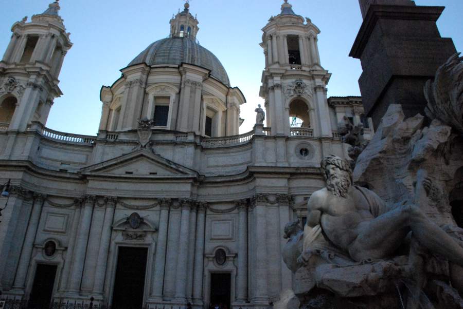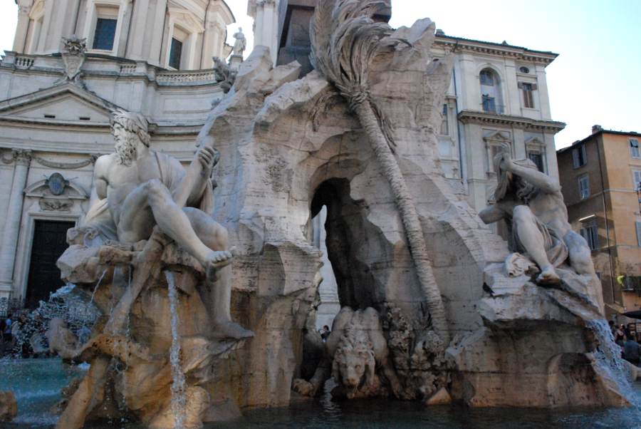 La place est dominée par la fontaine des Quatre-Fleuves du Bernin (1651), chef-d’œuvre de sculpture baroque où le Nil, le Gange, le Danube et le Rio de la Plata personnifient les continents connus, supportant un obélisque ramené du cirque de Maxence. Face à elle, l’église Sainte-Agnès-en-Agone de Borromini et Rainaldi dresse sa façade concave, réponse architecturale à la fontaine du Bernin dans leur célèbre rivalité artistique.