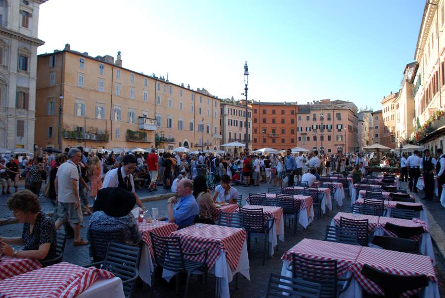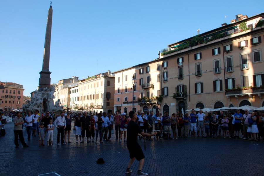 Tout à la fois élégante, extravagante et captivante, la Piazza Navona est un terrain de jeux permanent pour les saltimbanques de tout poil et les artistes de rue qui se frayent un chemin au milieu des terrasses des cafés. Une belle continuité.