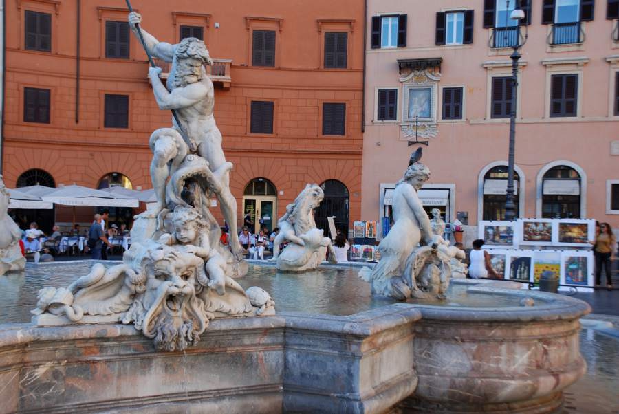 La fontaine du Maure (Bernini, 1653) et la fontaine de Neptune (della Bitta, 1878) complètent cet ensemble hydraulique qui témoigne de la maîtrise romaine de l’eau, alimenté par l’acquedotto Vergine encore en fonction depuis l’Antiquité.