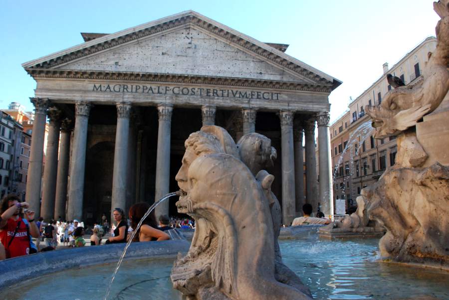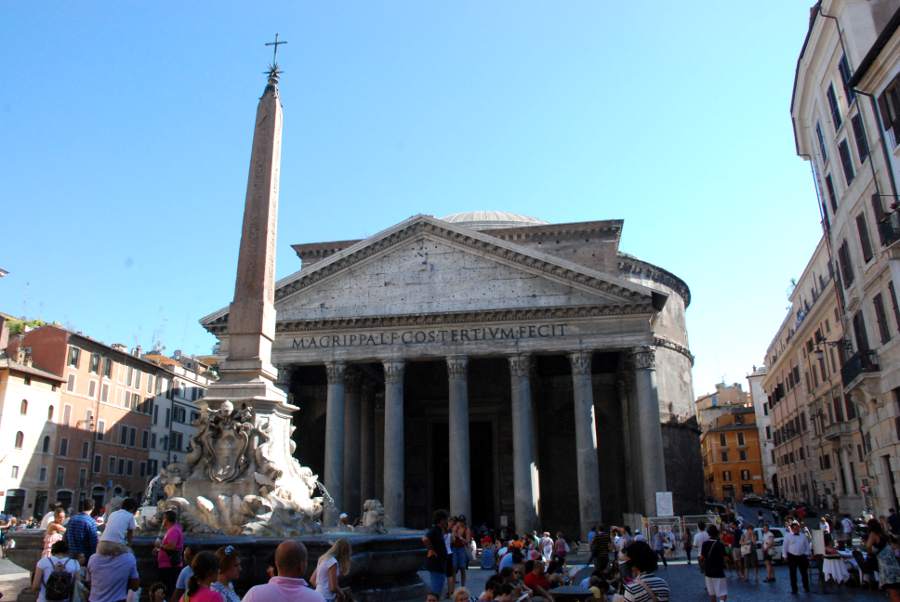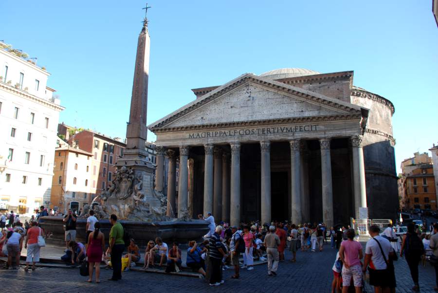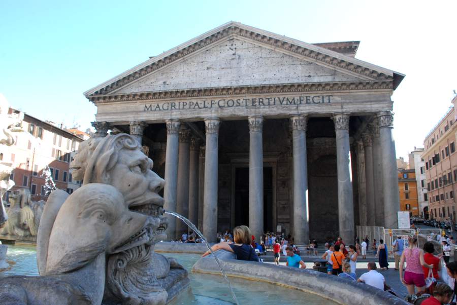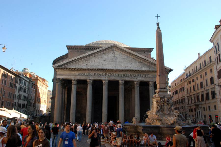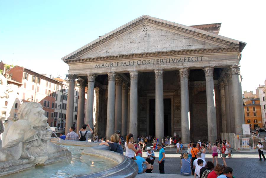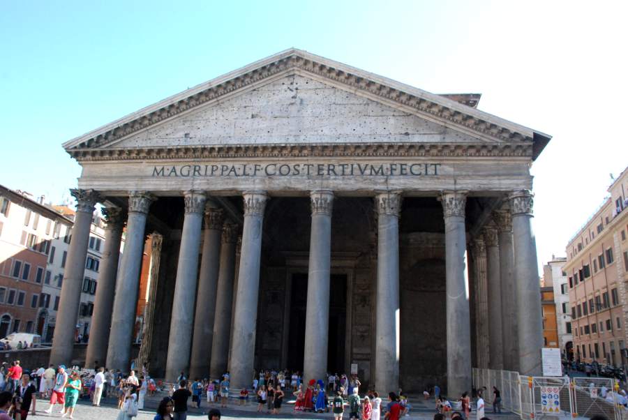 Contrairement à ce qu’indique l’inscription du portique, “M. Agrippa L.F. Cos Tercium Fecit” (Marcus Agrippa, fils de Lucius, consul pour la troisième fois, fit ceci”), l’édifice le plus spectaculaire de la Rome antique est principalement l’œuvre d’Hadrien. Le premier temple élevé ici par Agrippa, en 27 av. J.-C. n’avait pas résisté au terrible incendie de l’an 80 apr. J.-C. Si le bâtiment à l’arrière du Panthéon peut encore lui en être attribué, l’imposante rotonde, gloire de Rome, revient bien à Hadrien.