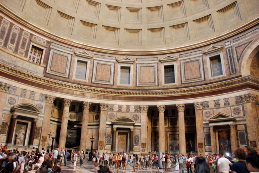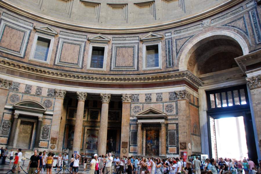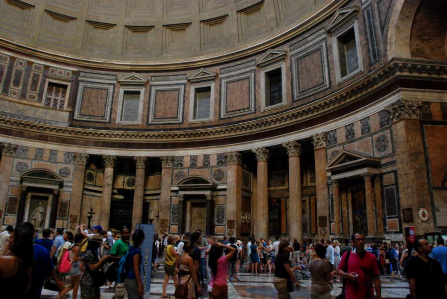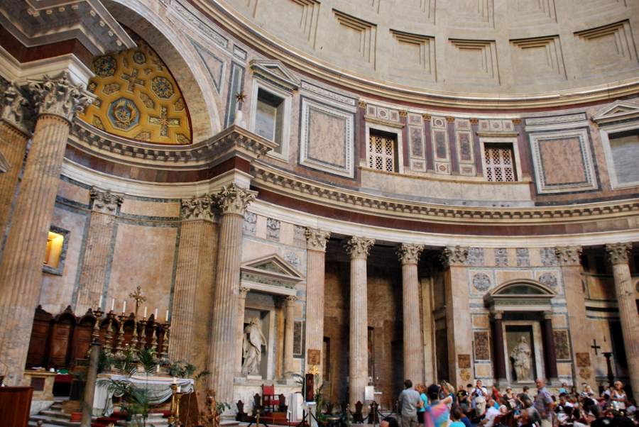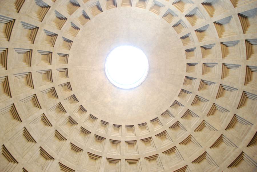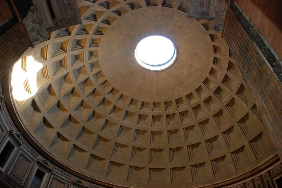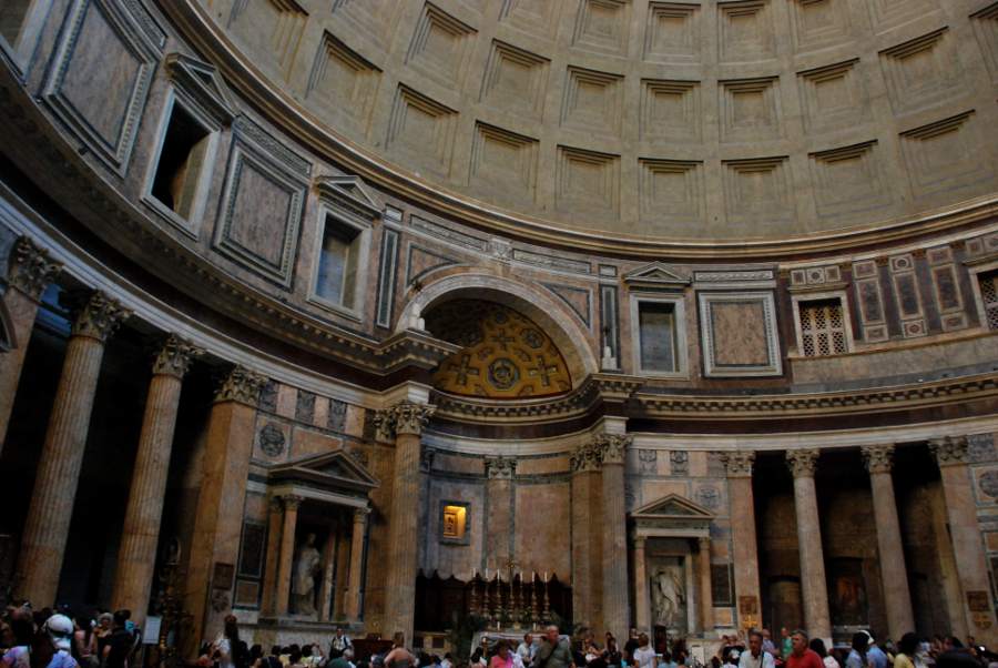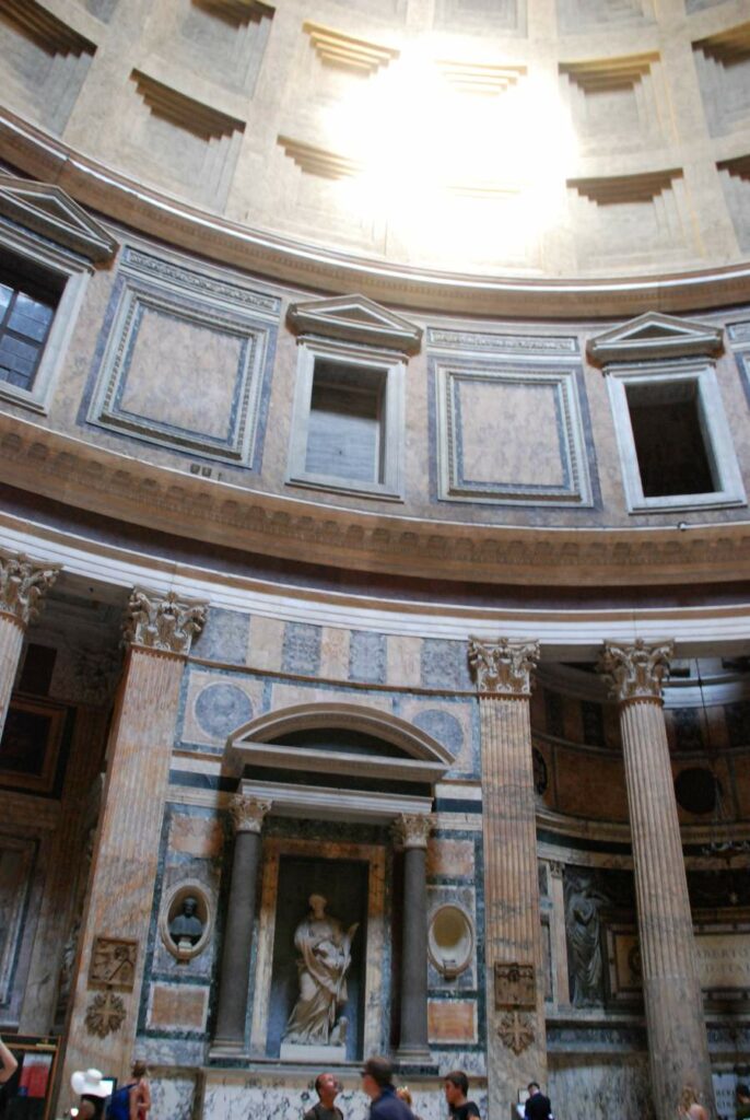 L’intérieur du Panthéon est tout simplement exceptionnel. On franchit d’abord une porte de bronze à double-battant, puis une fois au centre, c’est l’apothéose. Il suffit de lever la tête. Voici la plus grande coupole du monde : 43,30 m de diamètre pour une hauteur égale : 43,30 m… Du génie ! Ouverte sur le ciel par oculus central de 9 m de diamètre. Du coup, quand il pleut, il pleut à l’intérieur ! Cette coupole servira de référence à Bramante et à Michel-Ange qui travailleront à la réalisation de la coupole de Saint-Pierre dont pourtant le diamètre (42 m) ne parviendra pas à égaler celui du Panthéon.