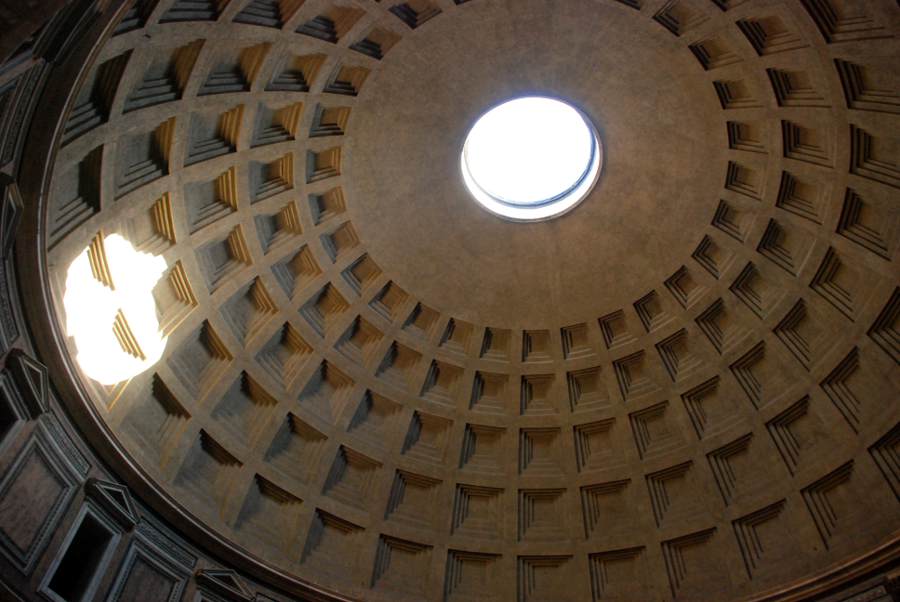 La coupole constitue une prouesse astrophysique : son oculus de 8,7 mètres de diamètre fonctionne comme un gigantesque cadran solaire, projetant sur le pavement et les niches intérieures une tache lumineuse qui se déplace au rythme des saisons. Le 21 avril, date mythique de la fondation de Rome, le rayon midi illumine parfaitement l’entrée principale. Cette ouverture unique, combinée aux judicieuses perforations du pavement, permet aussi l’évacuation des eaux de pluie tout en maintenant l’acoustique spectaculaire du lieu.