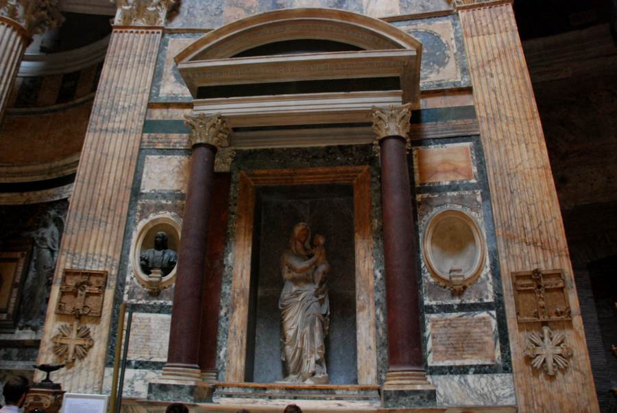 À l’intérieur encore, d’immenses colonnes monolithiques annoncent chacune des niches dans lesquelles étaient autrefois placées les statues des dieux. Aujourd’hui, elles abritent les tombeaux des rois d’Italie, dont celle de Victor-Emmanuel II. Mais le plus symbolique reste la tombe de Raphaël surmontée d’une Madone.